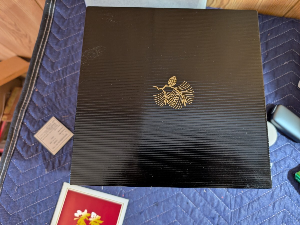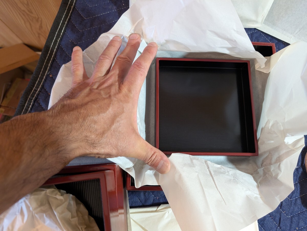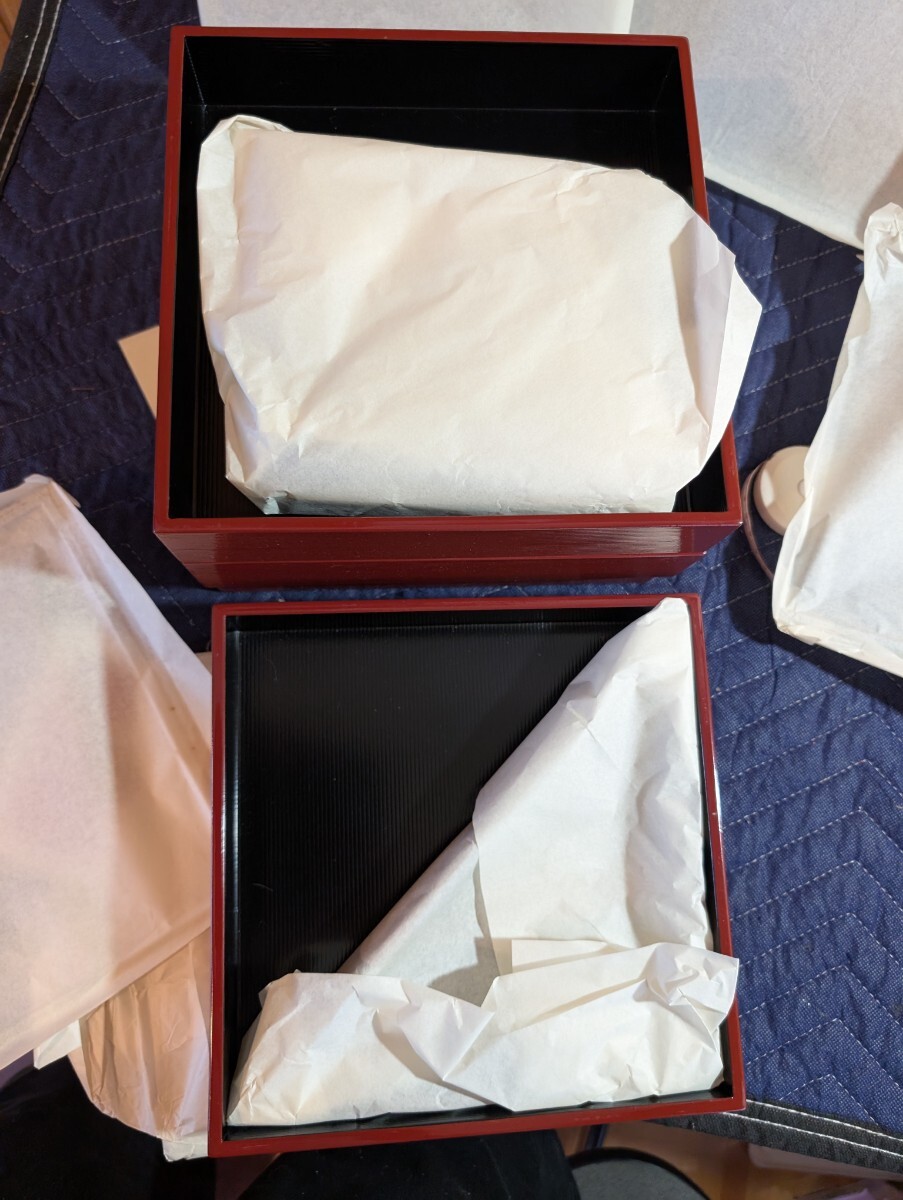 越前塗の重箱だと思います。全部の段に、小さな箱が付いてます。梱包はプチプチを巻いて発送したいと思います。気になる点があれば質問して下さい。