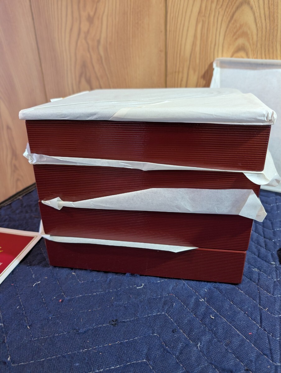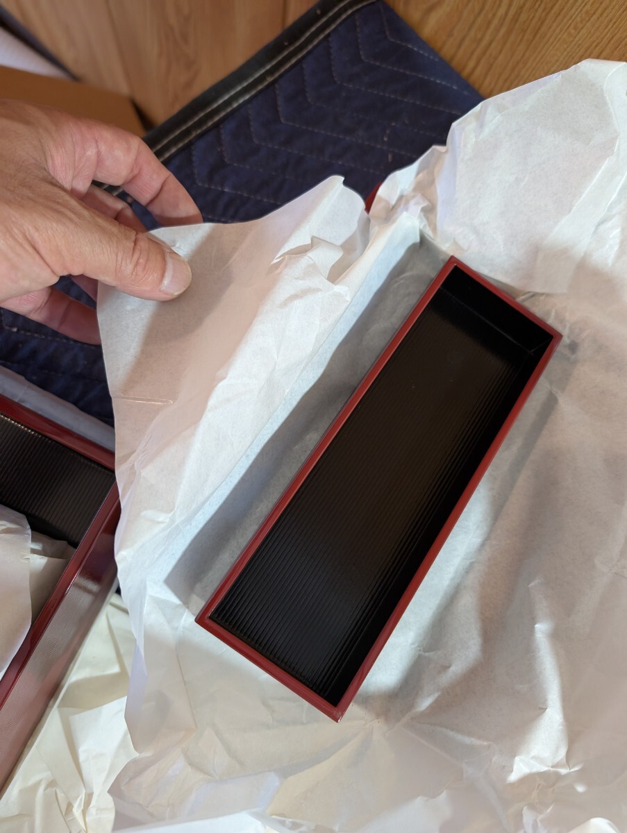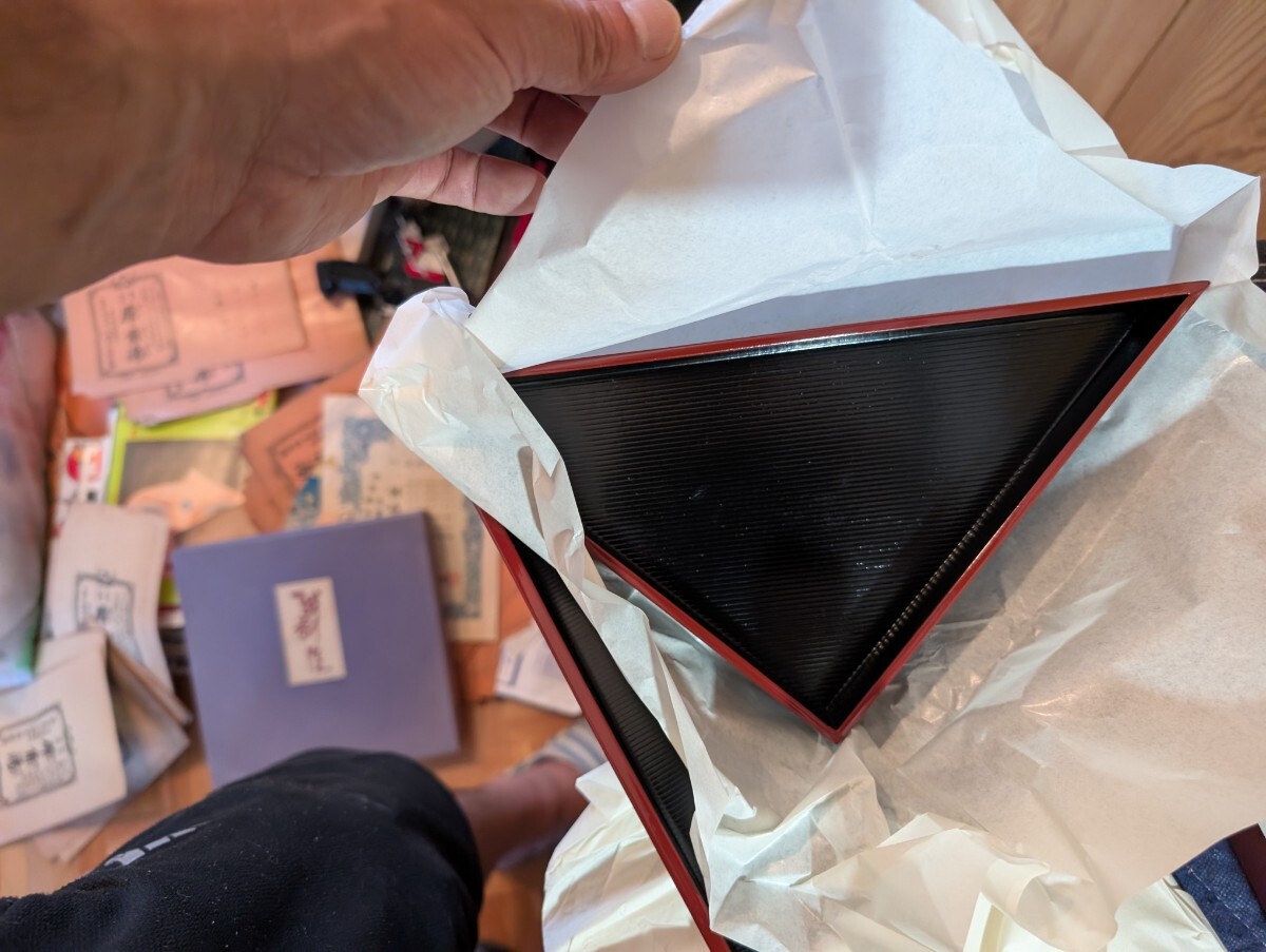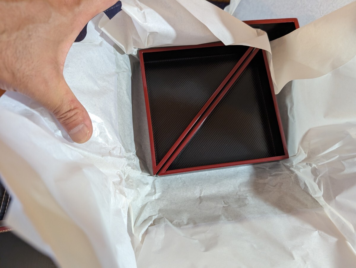 越前塗の重箱だと思います。全部の段に、小さな箱が付いてます。梱包はプチプチを巻いて発送したいと思います。気になる点があれば質問して下さい。