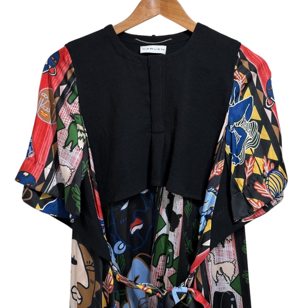 美品 Carven カルヴェン アートプリント 半袖 ひざ丈 デザインワンピース サイズ34 ブラック