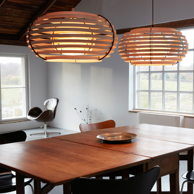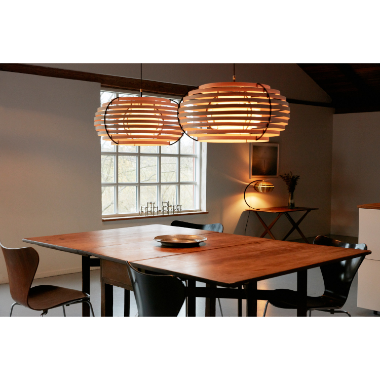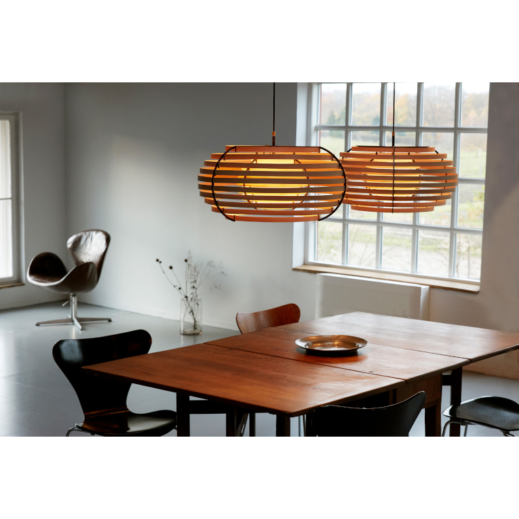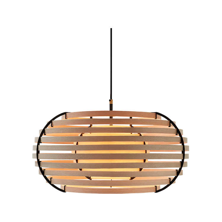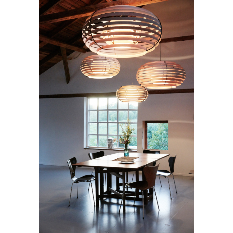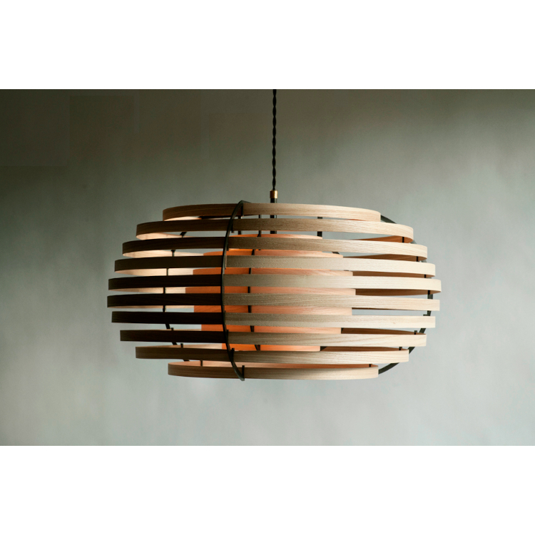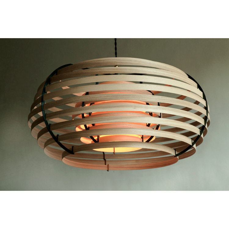 太陽の光が葉や木々を照らしている時に生み出されるユニークな模様と影を描く日本の概念「木漏れ日」に触発されたランプで、木製のシンプルな帯状のデザインで構成されています。