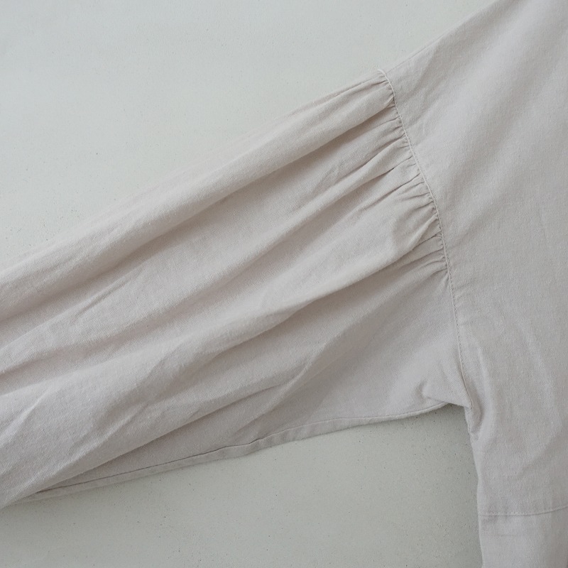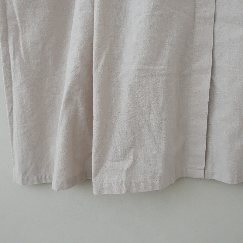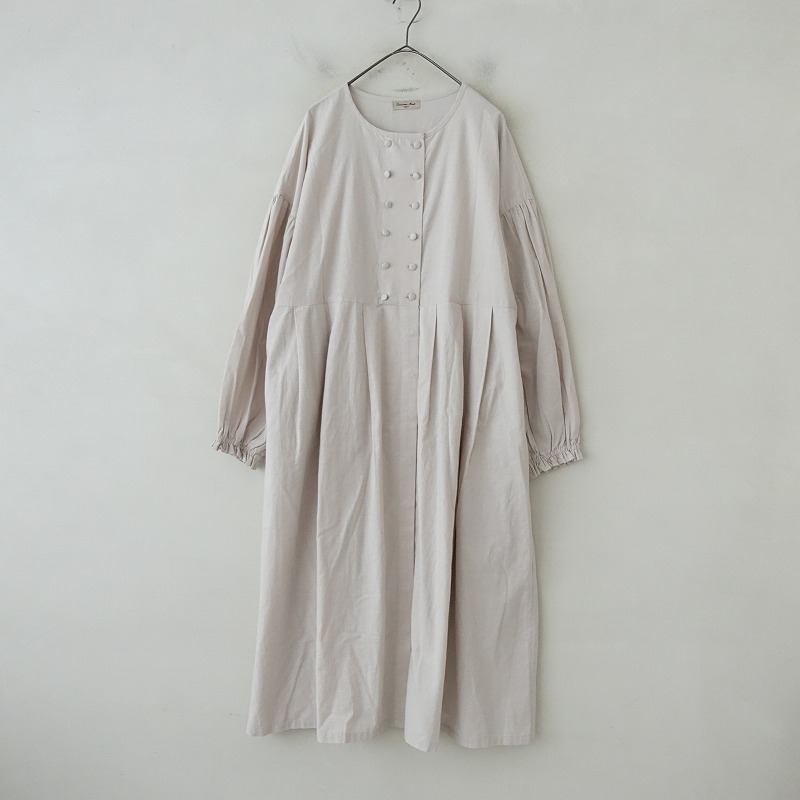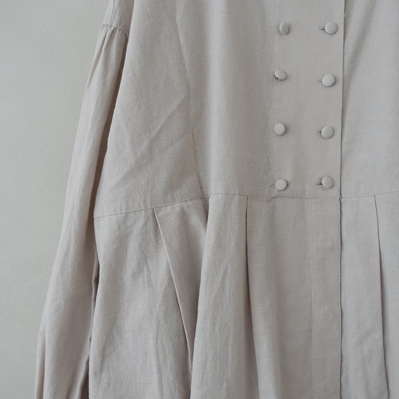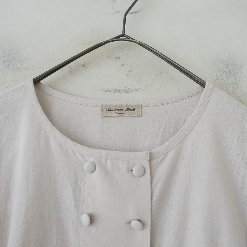 | Samansa Mos2 のダブルボタン羽織りワンピースです。カラーはアイスグレージュです。表面にピーチ起毛を配した柔らかなやや薄手綿麻生地を使用。少し透け感がございます。上身頃はダブルボタン、スカート部分は比翼ボタン開きの羽織も可能なワンピースです。肩が落ちたドロップショルダー、袖山にギャザーを寄せ、袖口にゴムが通されたボリュームスリーブです。腰両サイドにシームポケットがございます。 |