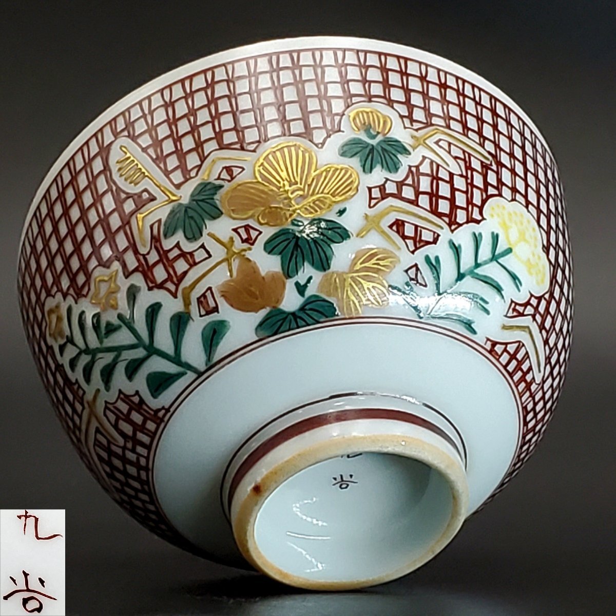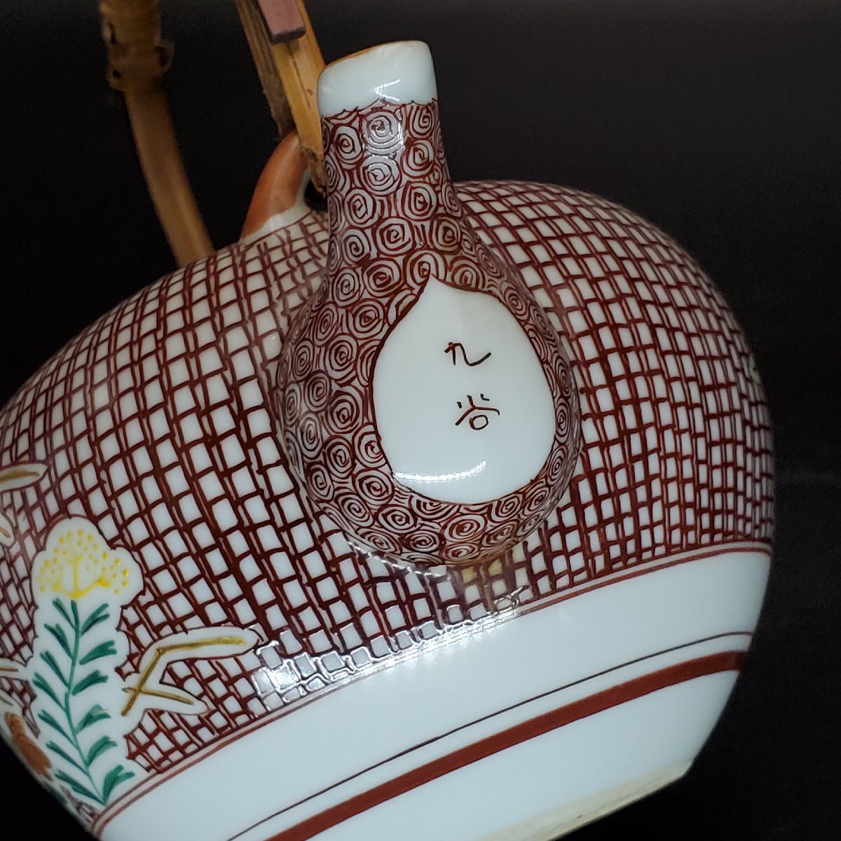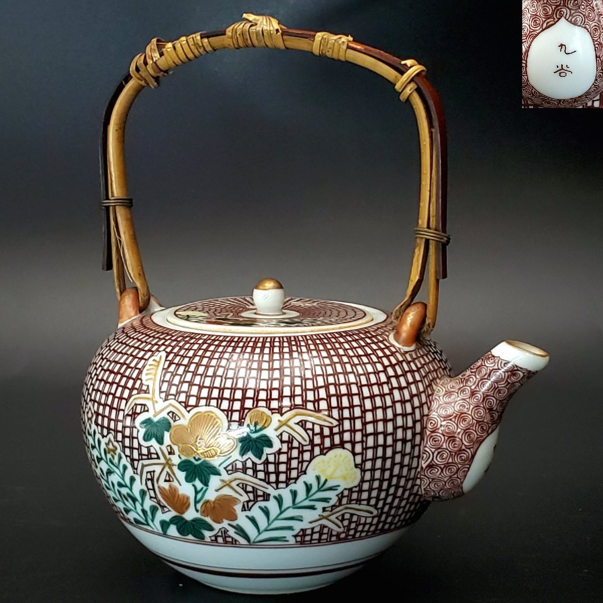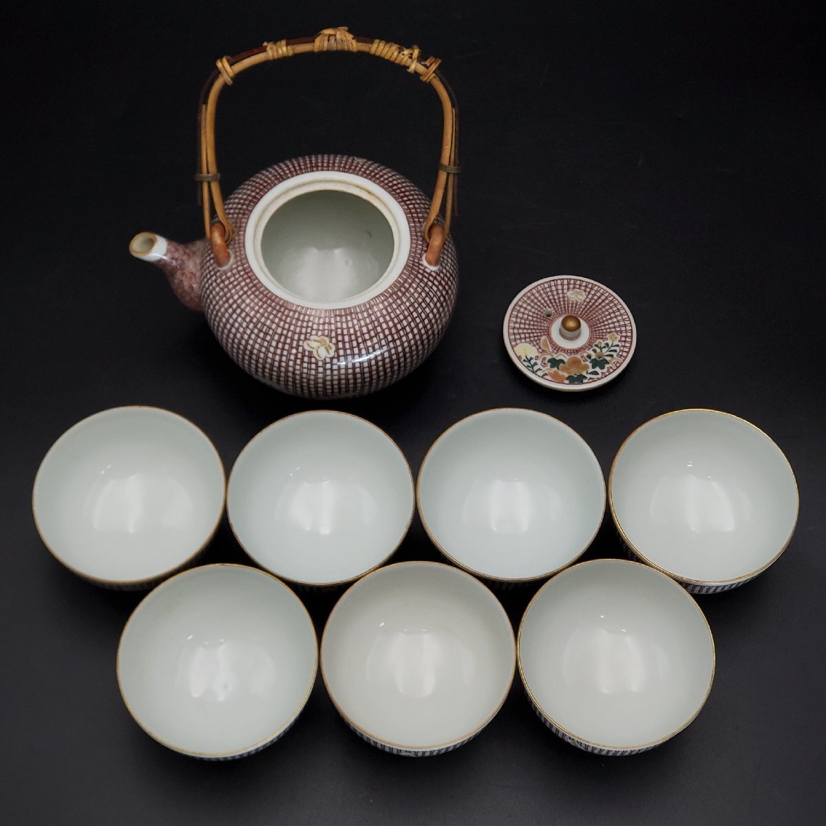 【宝蔵】九谷焼 手描赤絵網目文 草花色絵 茶器揃え 急須 煎茶碗7客 煎茶道具 時代物