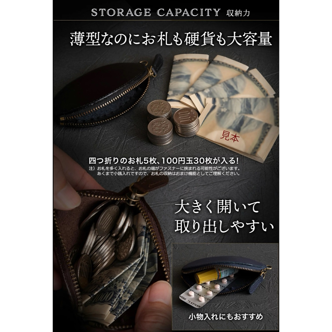 小銭30枚・お札5枚程度まで収納可能なミニマル設計で、ポケットにすっぽり収まるサイズ感。