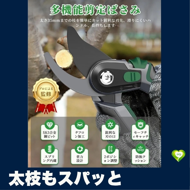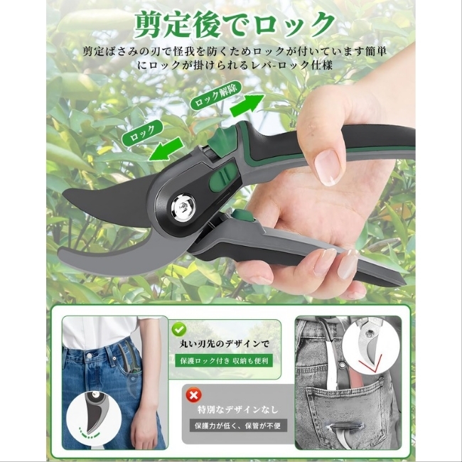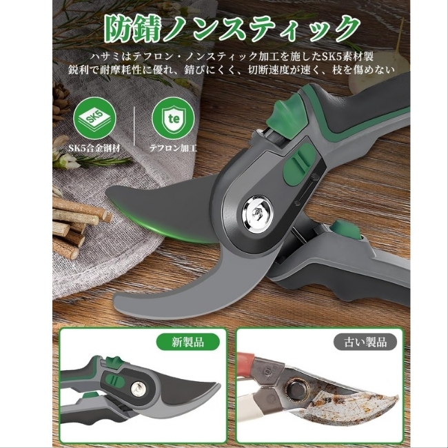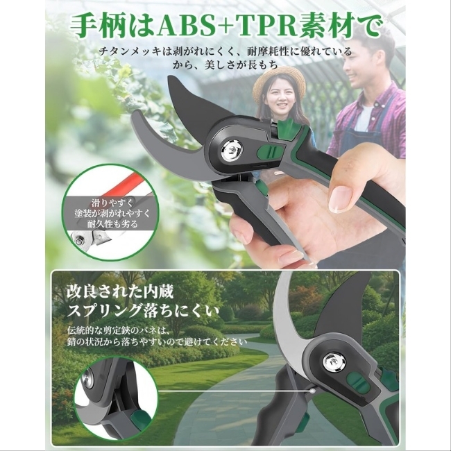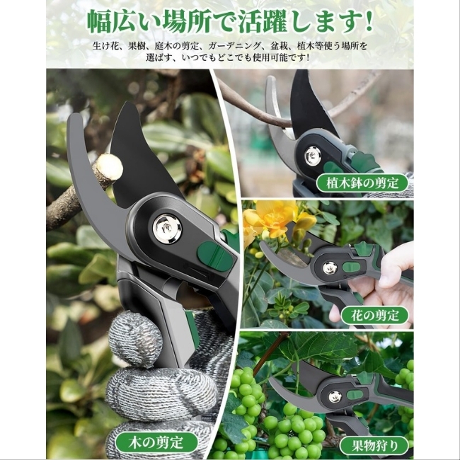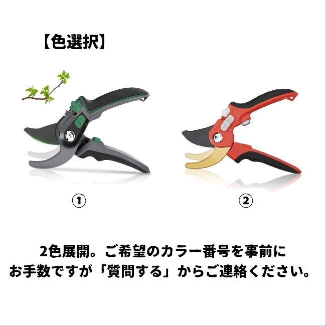 ご覧いただきありがとうございます。 2色展開です。 ご希望の色を事前に お手数ですが「質問する」からご連絡ください。 商品名:剪定ばさみ 【この商品が品質で選ばれる理由】 SK85鋼の刃にチタンメッキを施し、錆びにくく切れ味が長持ちします。 ■こんな悩みありませんか? ・雨の日の作業で道具が濡れてしまう ・土や泥で道具が汚れてお手入れが大変 ・硬い枝を切るのに力が必要で手が疲れる ★こんな時におすすめ! ・庭木の剪定を楽に終わらせたい時 ・果樹のお手入れをスムーズにしたい時 ・屋外での作業が多い時 ーーーーーーーーーーーーーーーーーーーーーーーーーーー 【切れ味と耐久性】 ・刃は硬度と靭性を兼ね備えたSK85(SK5)鋼を使用しており、切れ味長持ちです。 ・チタンメッキにより錆びにくく、お手入れがしやすいです。 ・少量のアルミニウム合金を使用しており、耐久性があります。 【作業効率をサポート】 ・刃の開きを自由に調節できるので、異なる太さの枝も簡単に切ることができます。 ・小枝から広葉樹の枝まで幅広く対応しています。 【快適な使い心地】 ・人間工学に基づいて設計されたハンドルは、ABSとTPR素材でできており滑りにくいです。 ・長時間の作業でも手が疲れにくいデザインです。 【安全設計】 ・内蔵スプリング設計を採用しており、スプリングの脱落を防ぎます。 ・安全ロックにより、使用しない時にハサミが誤って開くのを防ぎ、安全に保管できます。 ご不明な点などございましたら お気軽に「質問する」からお問い合わせください。 |