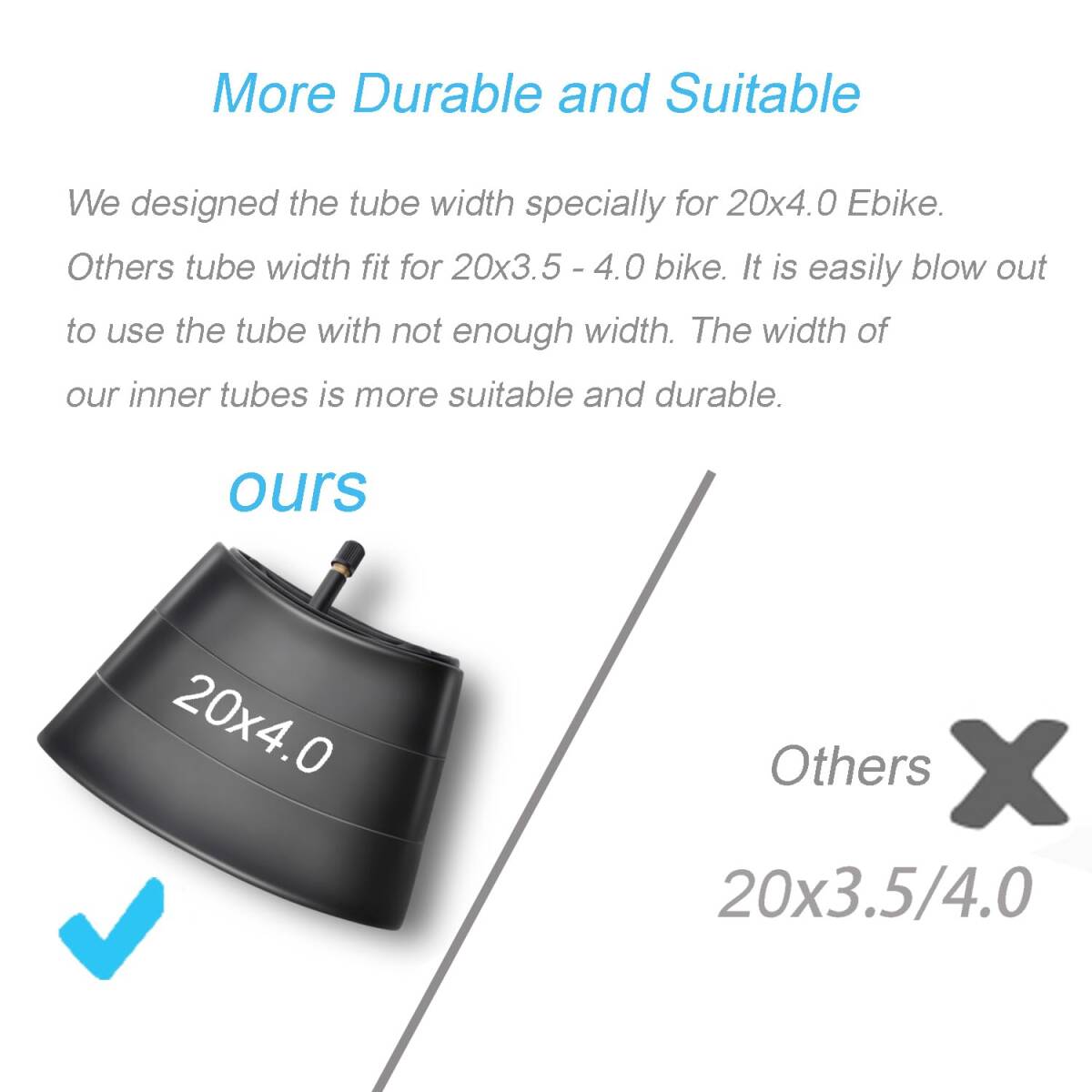 | 商品説明 | 完璧にフィット:当社の自転車用インナーチューブは、20インチのファットタイヤバイク、電動自転車にフィットします。 20x4.0 Ebike用に特別にチューブ幅を設計しました。 その他のチューブ幅は20x3.5~4.0の自転車にフィットします。 幅が足りないチューブを使用するために簡単にポップできます。 当社のインナーチューブの幅はより適切で耐久性があります。 バルブタイプ&長さ:簡単に膨らませられる米式バルブステム(レギュラーバルブ)、35mm(1.38インチ)バルブコアキャップ付き。 ホイールサイズ:20インチ 耐久性:当社の自転車チューブはプレミアムブチルゴムで作られているため、一般的な自転車のインナーチューブよりも耐久性があります。 内容物:20×4インチのファットタイヤチューブ2個パック。
