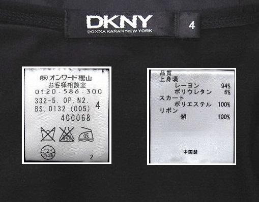 ブランド .DKNY ダナキャラン ㈱オンワード樫山 特徴 上身頃ストレッチの効いたカットソー スカート部分は張りのある光沢素材 ウエストにシルクのリボン(取り外し不可)がアクセント サイドファスナー仕様