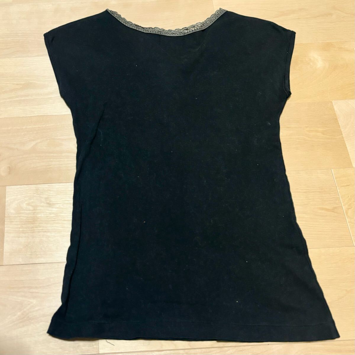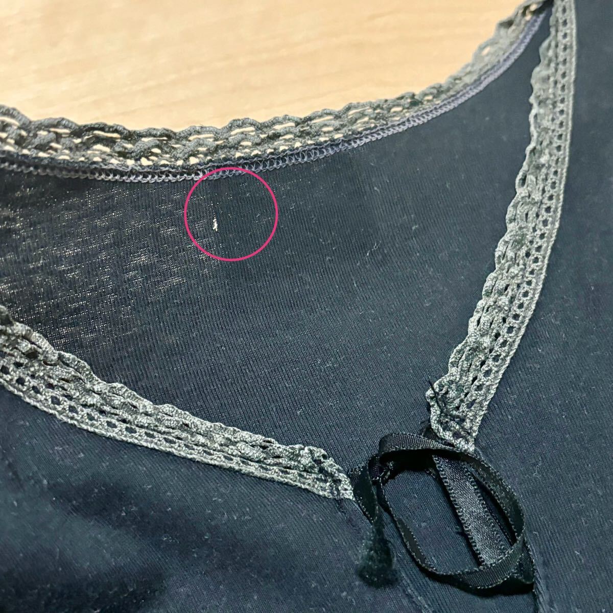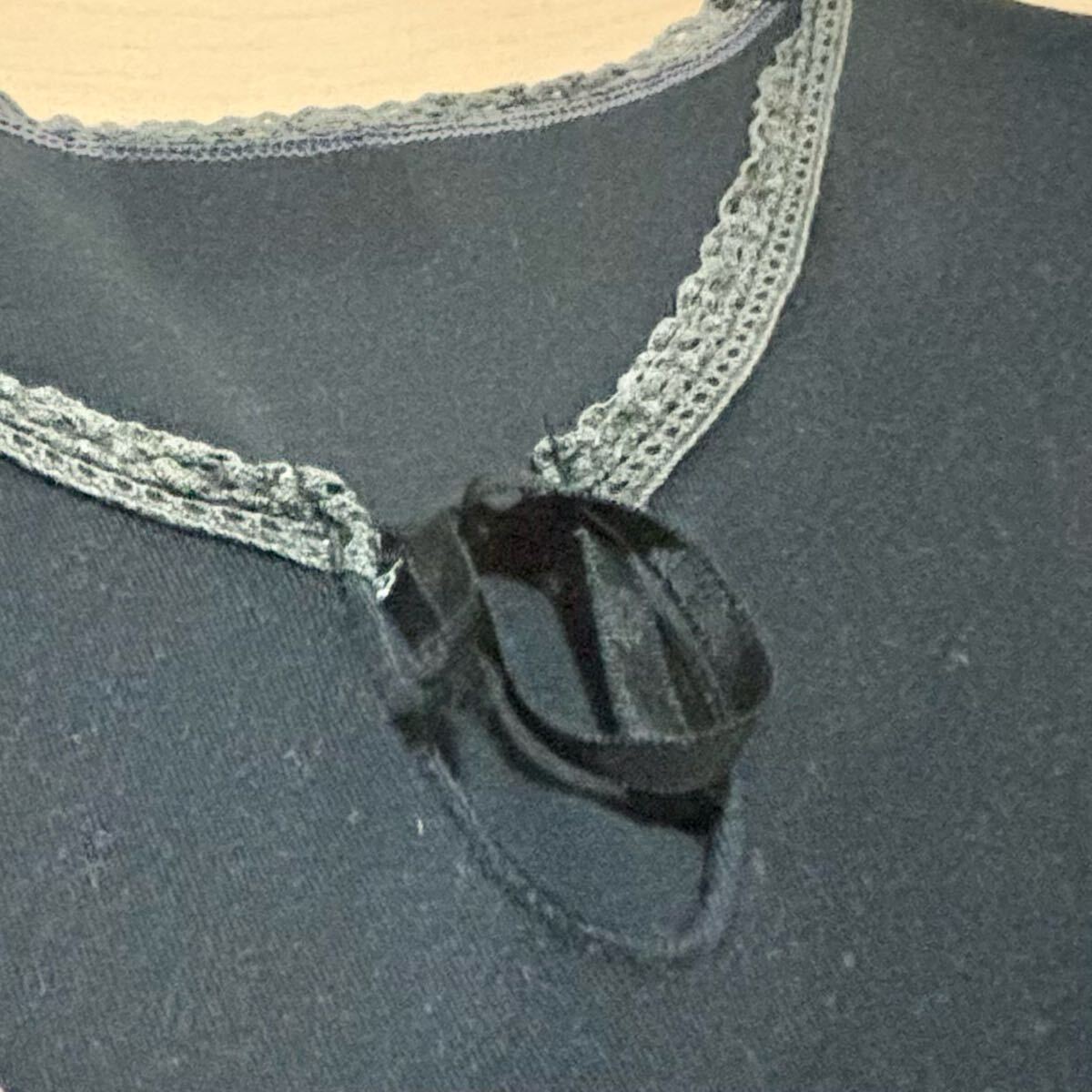 Vネックに見えるようなデザインでリボンを結ぶ形となっており、襟ぐりがレースになっています。