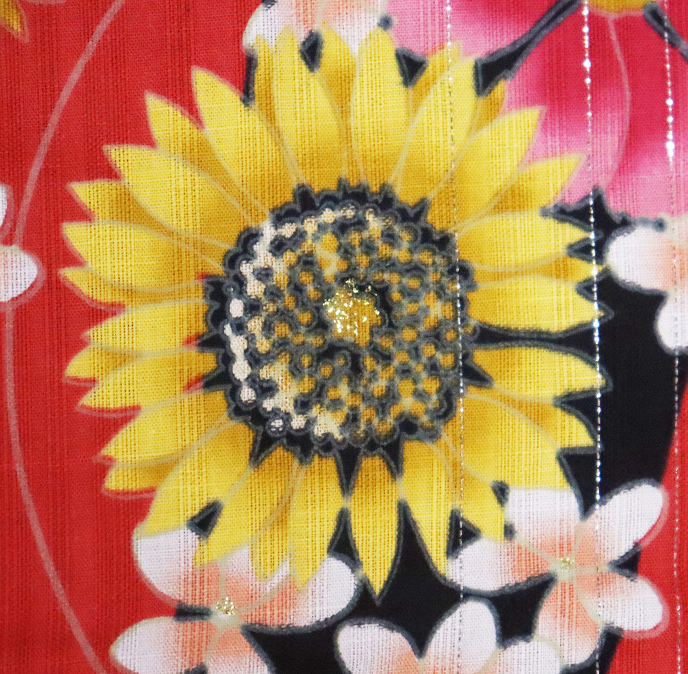 綿紗もじり織縦縞 薄赤色・黒地 ひまわり 銀縦縞