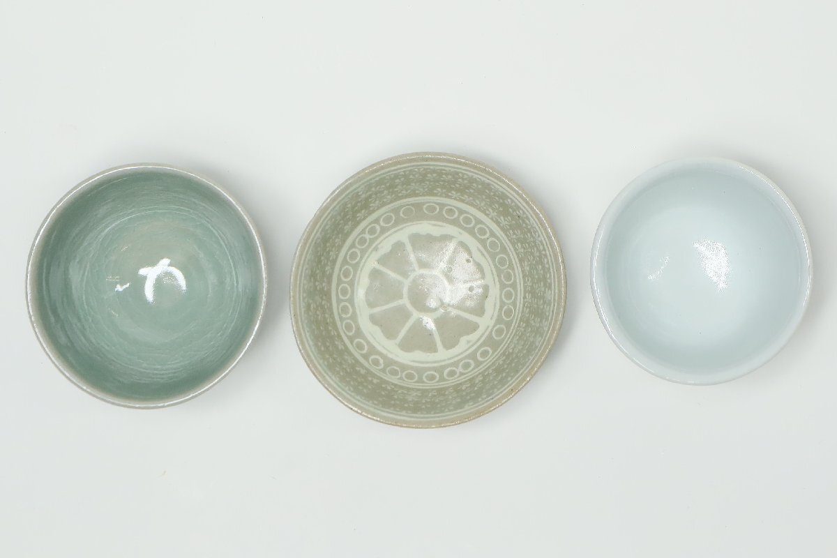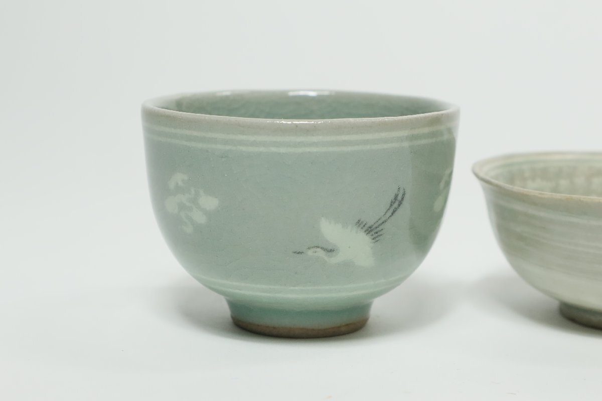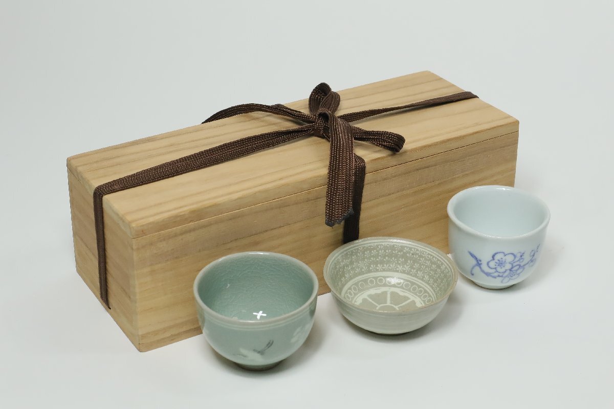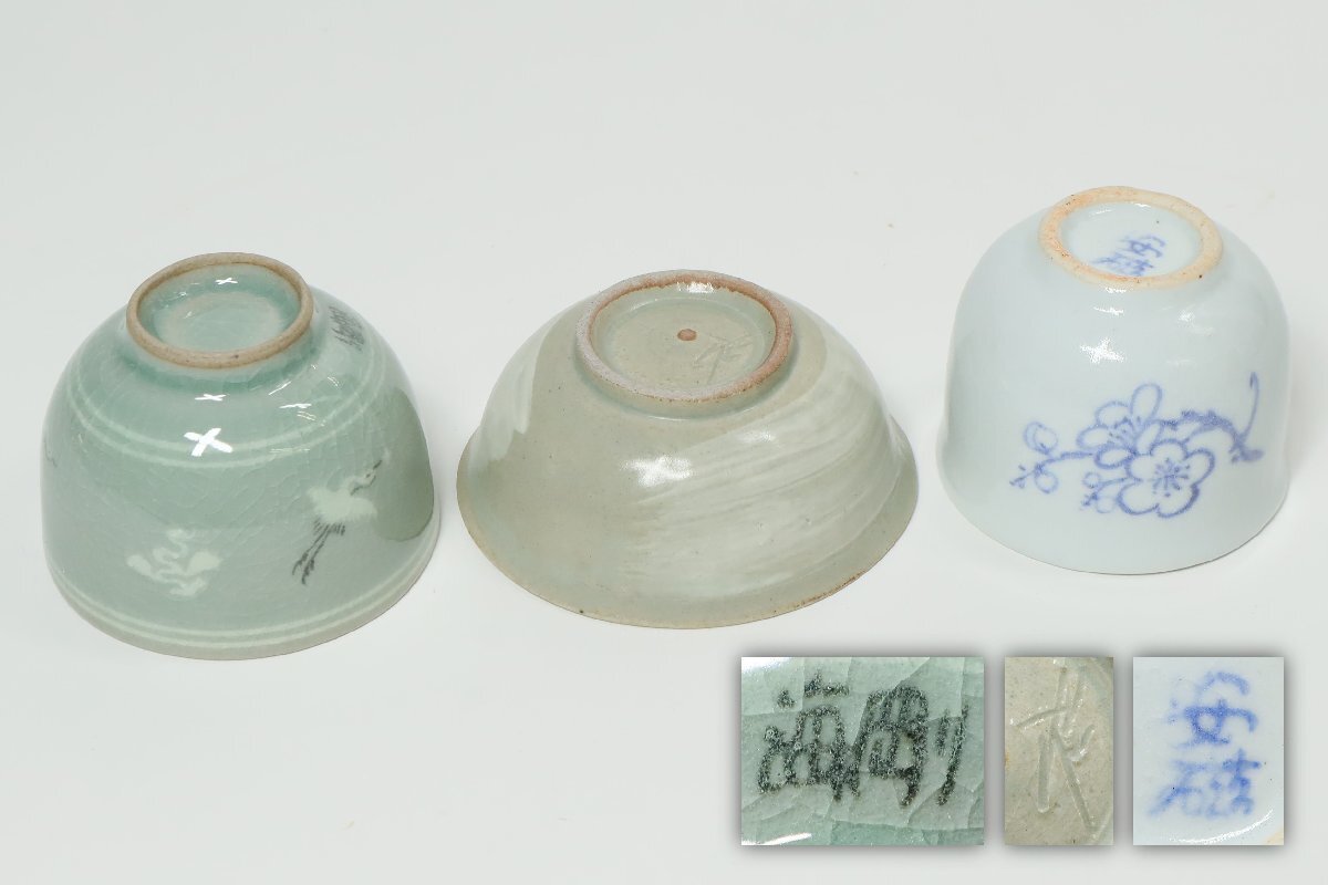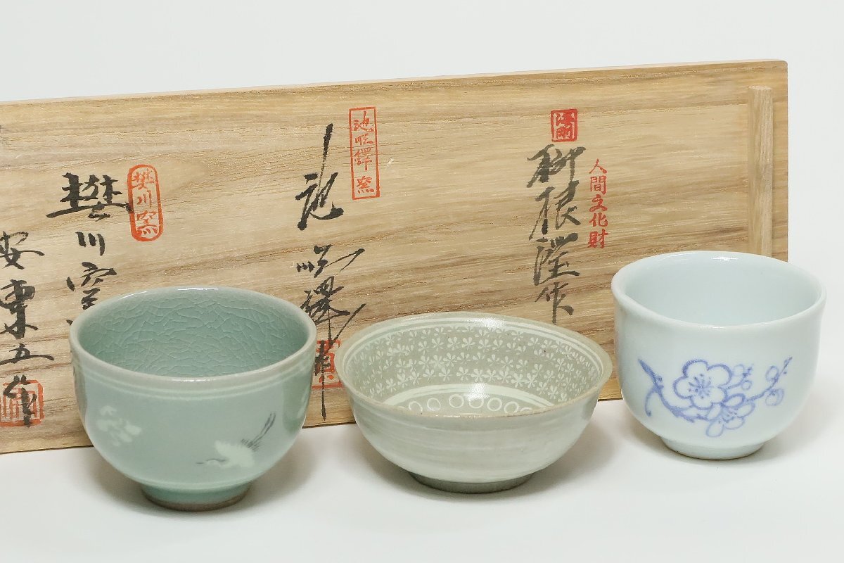 | ・韓国陶磁器名工 柳根瀅 池順鐸 安東五 盃揃 共箱 /青瓷 海剛 三島 染付 酒杯 ぐい呑み 酒器 | ||||||||||