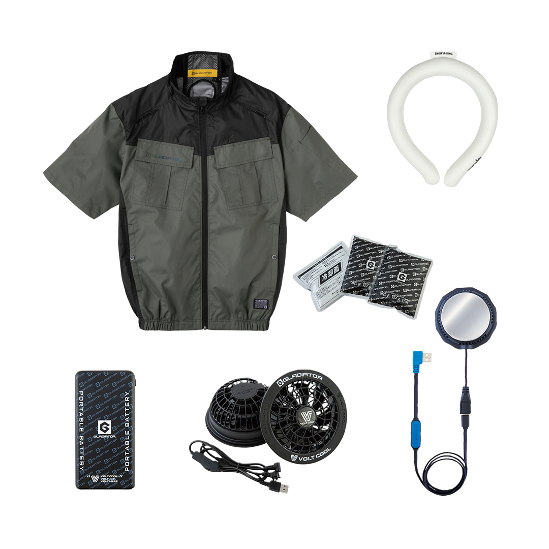 【商品名】ボルトクール 日傘遮熱 空調半袖 ペルチェ×アイス(保冷剤)×空調服 フルセット(6点)