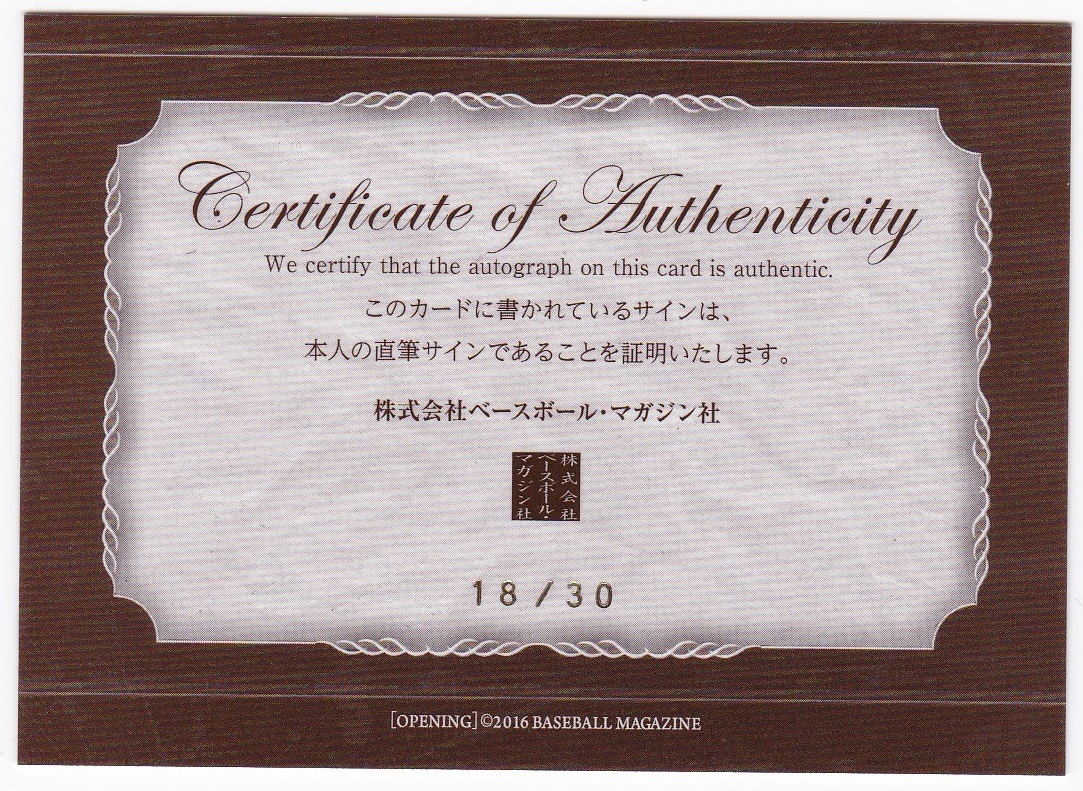 【浦野博司】2016 BBM 北海道日本ハムファイターズ「OPENING」直筆サインカード [18/30]