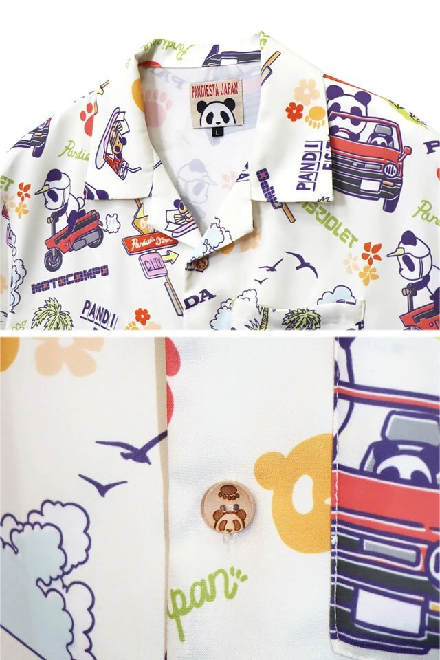 和柄ブランド【錦】の姉妹ブランドとして誕生した、お茶目なパンダをモチーフとした【PANDIESTA JAPAN】より「HONDA×PANDIESTA シティとモトコンポ アロハシャツ(585510)」のご紹介です。 今や、錦の定番モチーフとなった「錦PANDA」!! 今季リリースの半袖Tシャツのアートワークを元にしたデザイン。 1981年に『トールボーイ』というユニークなスタイルで登場し、ポップな80年代のアイコン的なクルマとして有名な『ホンダ・シティ&モトコンポ』をテーマにオールオーバーパターンをデザインしました。 『モトコンポ』とは、ホンダ・シティと同時発売されたミニバイクで、シティのトランク部分をガレージに見立ててデザインされており、従来のモデルにはない斬新な仕様が特徴的。Hondaならではのアイデアとコンセプトに溢れた『名作』にリスペクトを込めた製品となります。 なお、今夏シーズンは、シティシリーズのバリエーションの中でも特に人気のオープンタイプ『シティ・カブリオレ』をメインモチーフに起用し、暑い夏の日差しを連想させるようなアートワークと共にプリントで施しました。 汗をかいたり、洗濯時の速乾性を考慮し、どなたでも扱いやすいポリエステル布帛を使用したアロハシャツです。 Tシャツの上から気軽に羽織ったり、同じ生地を使用したショートパンツと合わせてセットアップでのスタイリングもオススメな一枚です。 | |||||||||||||||||||||||||