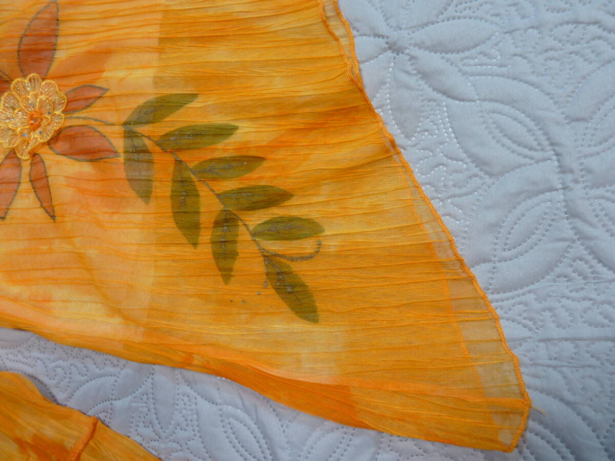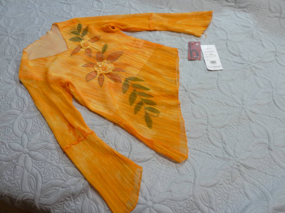 自己紹介を読んで下さいね。 新品タグ付き のオレンジ 染め風 地模様 のお花柄 のプルオーバーす。未使用の自宅保管です。サイズはL記載で、実寸、肩幅37-45cm、そで58cm、身幅47-57cm、着丈50-68cm、裾幅47-60cmくらいです。MからLサイズの方まで着て頂けますよ。素材は、ポリエステル100で薄手のしっかりした生地です。お手持ちのお洋服と合わせて下さいね。ゆうパケット230円発送がお安いです。ノーリターンでお願い致します。