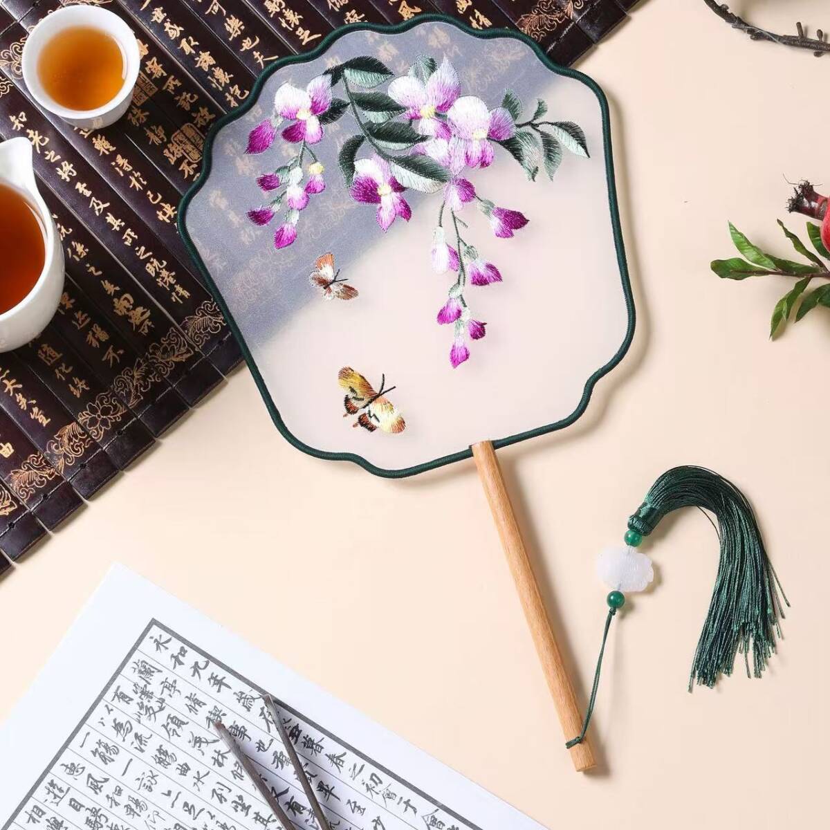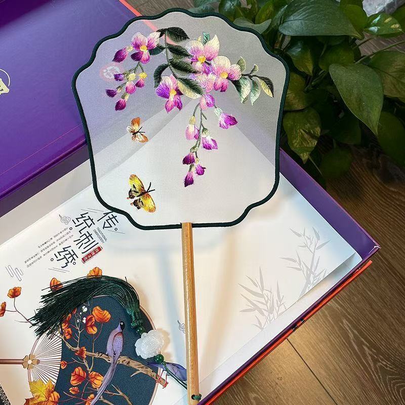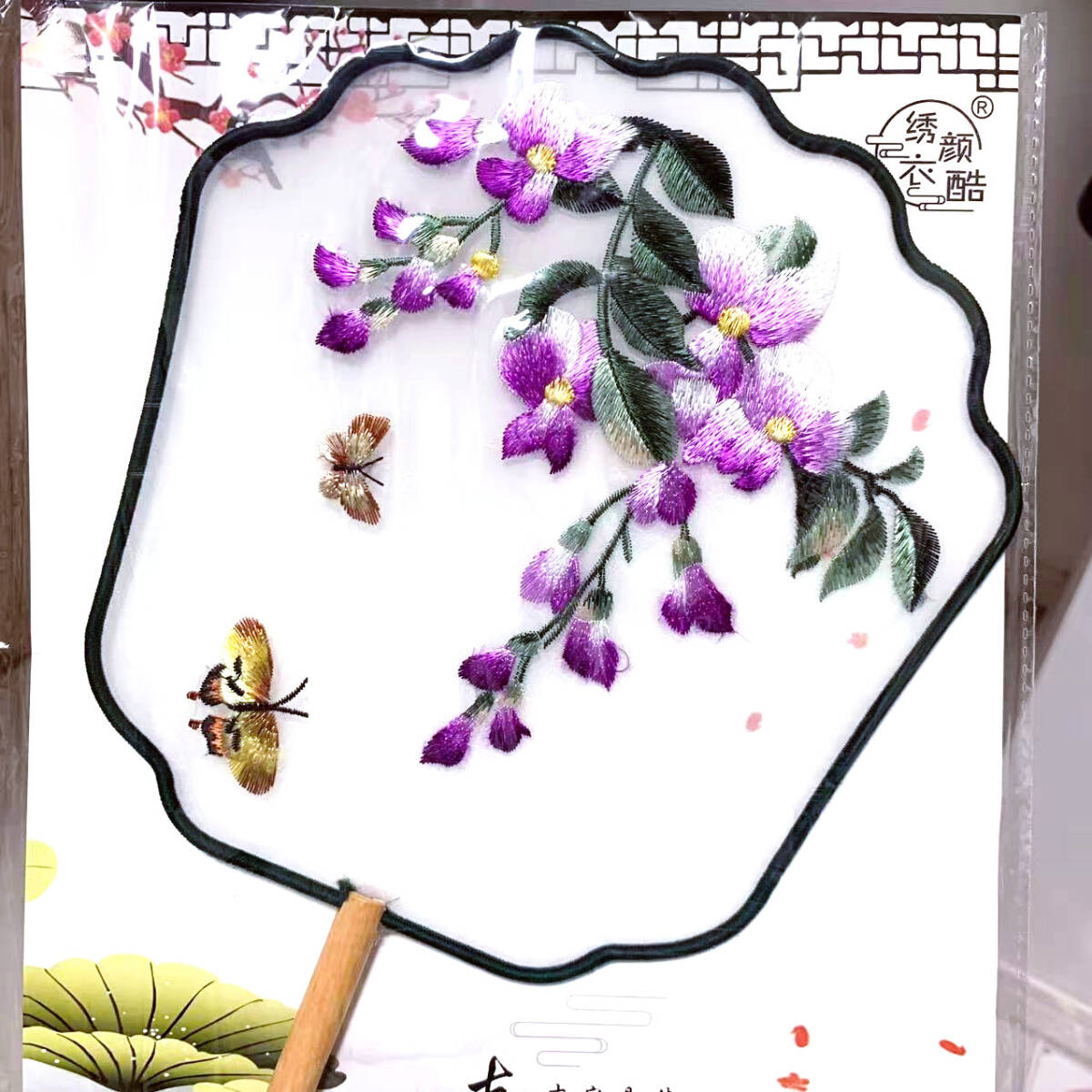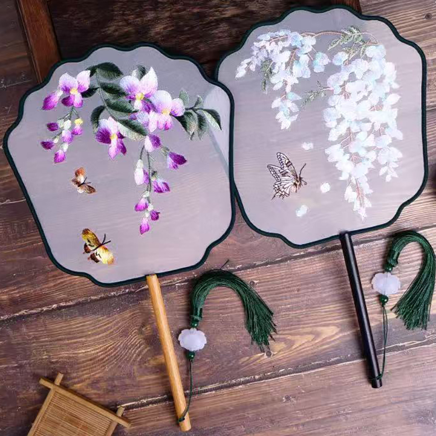 高級団扇 うちわ 両面刺繍 シルク素材 上品手芸 中国伝統刺繍 お祭り 藤の花