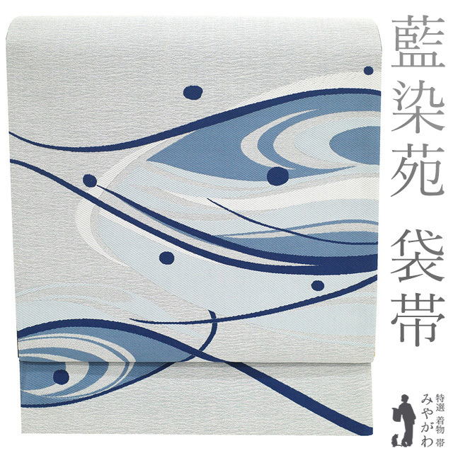 【新古品】 袋帯 未使用 正絹 藍染苑 本藍染糸織 京都 西陣 ライトグレー 水文 おしゃれ 上質 カジュアル 春 秋 冬 仕立て上がり みやがわ sb54120