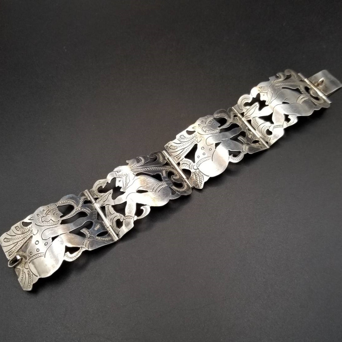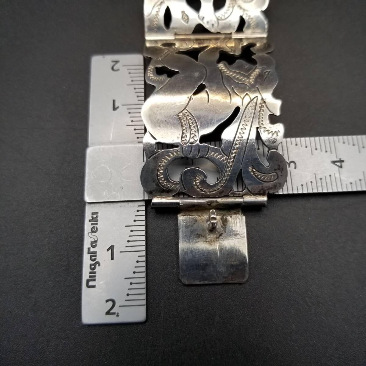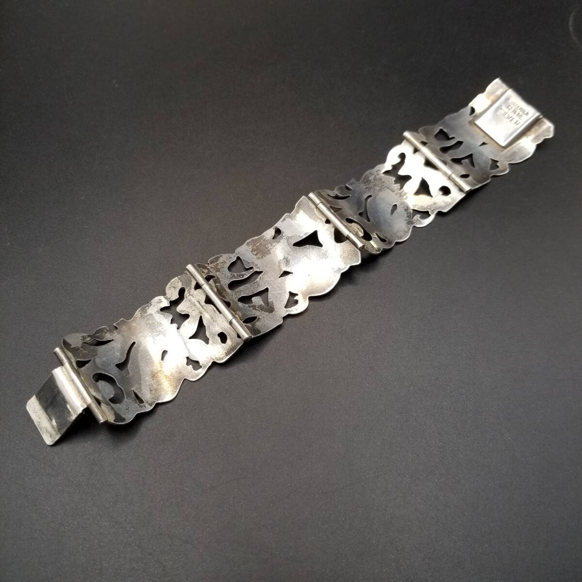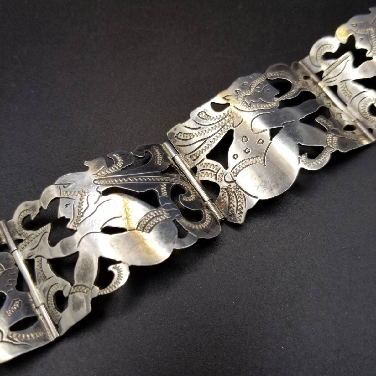 R&M Guatemala マヤ文明 鷲頭の戦士 パネルチェーン ヴィンテージ ブレスレット 925 シルバー 銀 極幅広 オープンワーク 23-V