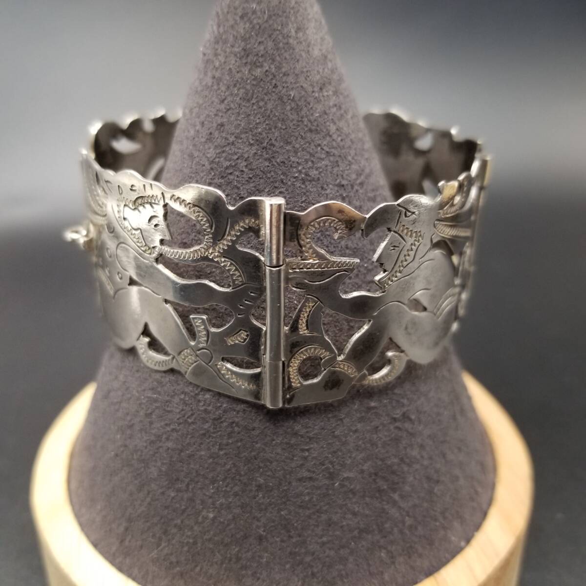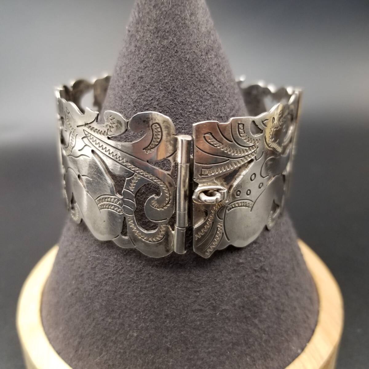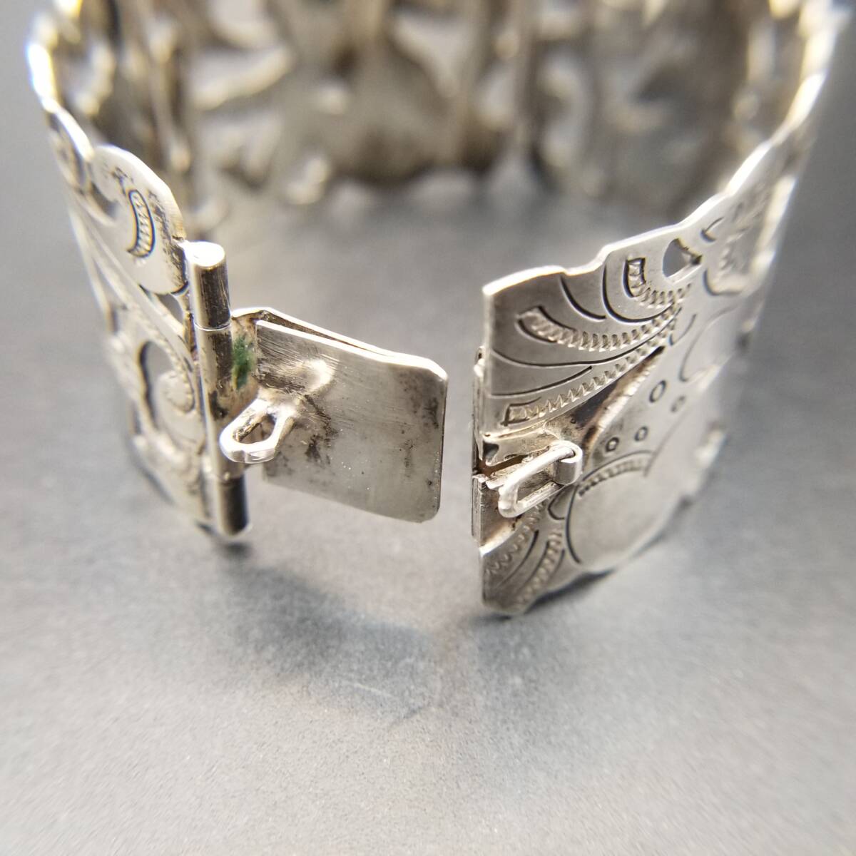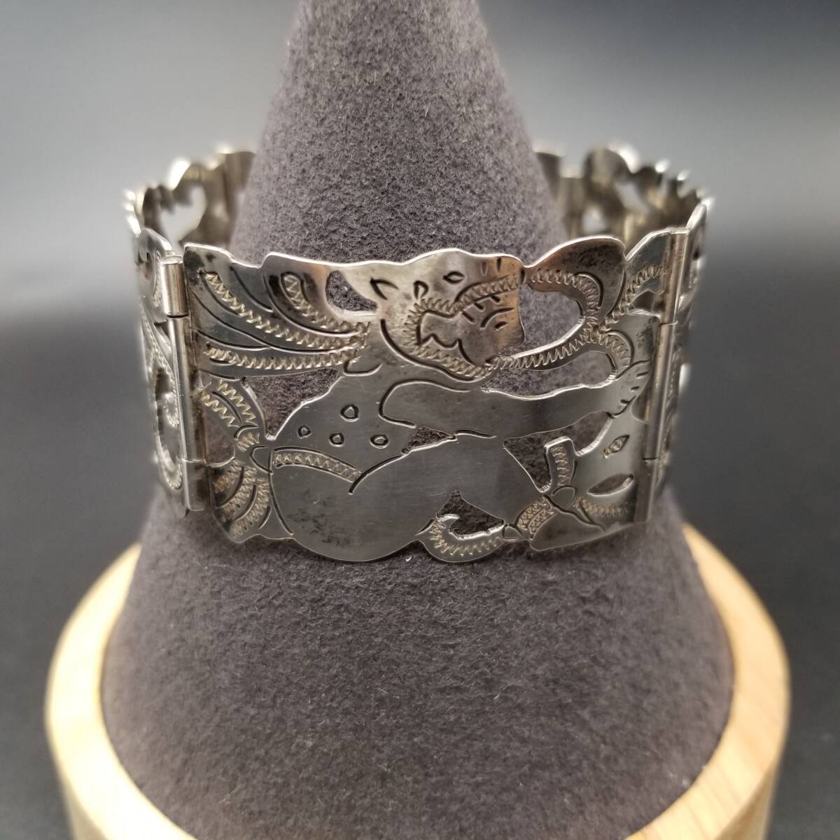R&M Guatemala マヤ文明 鷲頭の戦士 パネルチェーン ヴィンテージ ブレスレット 925 シルバー 銀 極幅広 オープンワーク 23-V
