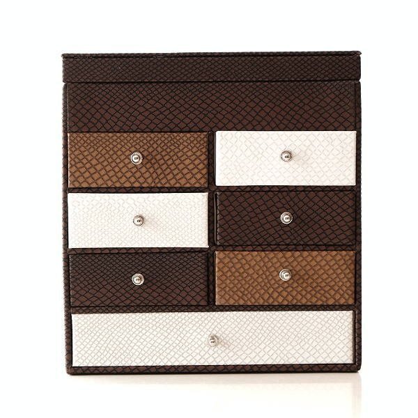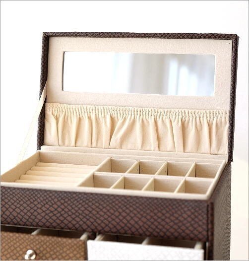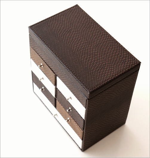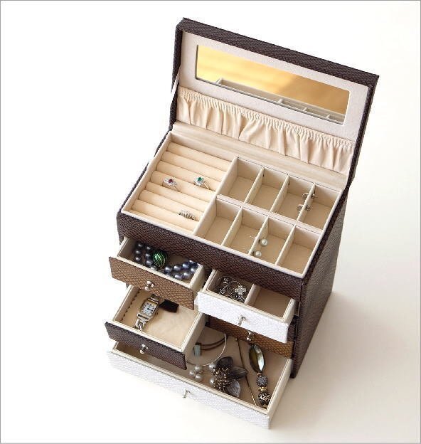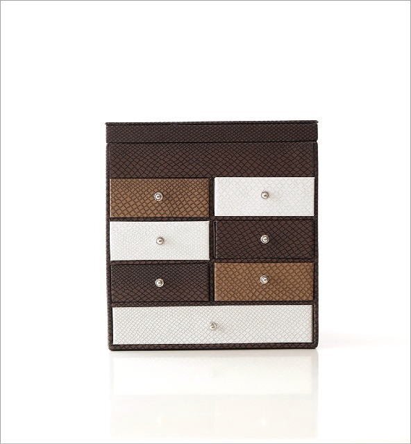 高級感のある、素材を使用した 大人なたたずまいのアクセサリーケース 細かいジュエリーも 大ぶりアクセもすべて一緒に収納でき 大切なアクセサリーを ホコリや紛失から守ります 精巧なミニチェストのようなルックス 様々なタイプの引き出しで アクセサリーを沢山収納できる アクセサリーケース ブラウンカラーで落ち着きのあるケースです 商品名 : チェストジュエリーボックス 商品番号 : uwr4060 全体サイズ(cm) : 幅19.5×奥行12×高さ21 上段収納サイズ(幅×奥行×深さ) : リング収納)7×10 個別収納 各)2.5×5×3 引き出し内サイズ(幅×奥行×深さ) : 大)17×9.5×2.5 小)7.5×9.5×2.5 ミラーサイズ : 横15×縦4 材質 : 合成皮革 ミラー 重量 : 1.5kg 生産国 : 中国 ※引き出しにストッパーはついていません ※ミラーや本体の小さな擦り傷、小傷はご容赦ください |