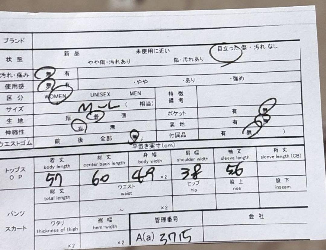 ※アパレルのブランドによりサイズ基準が異なるので、必ず採寸表をご確認の上、ご購入お願いいたします