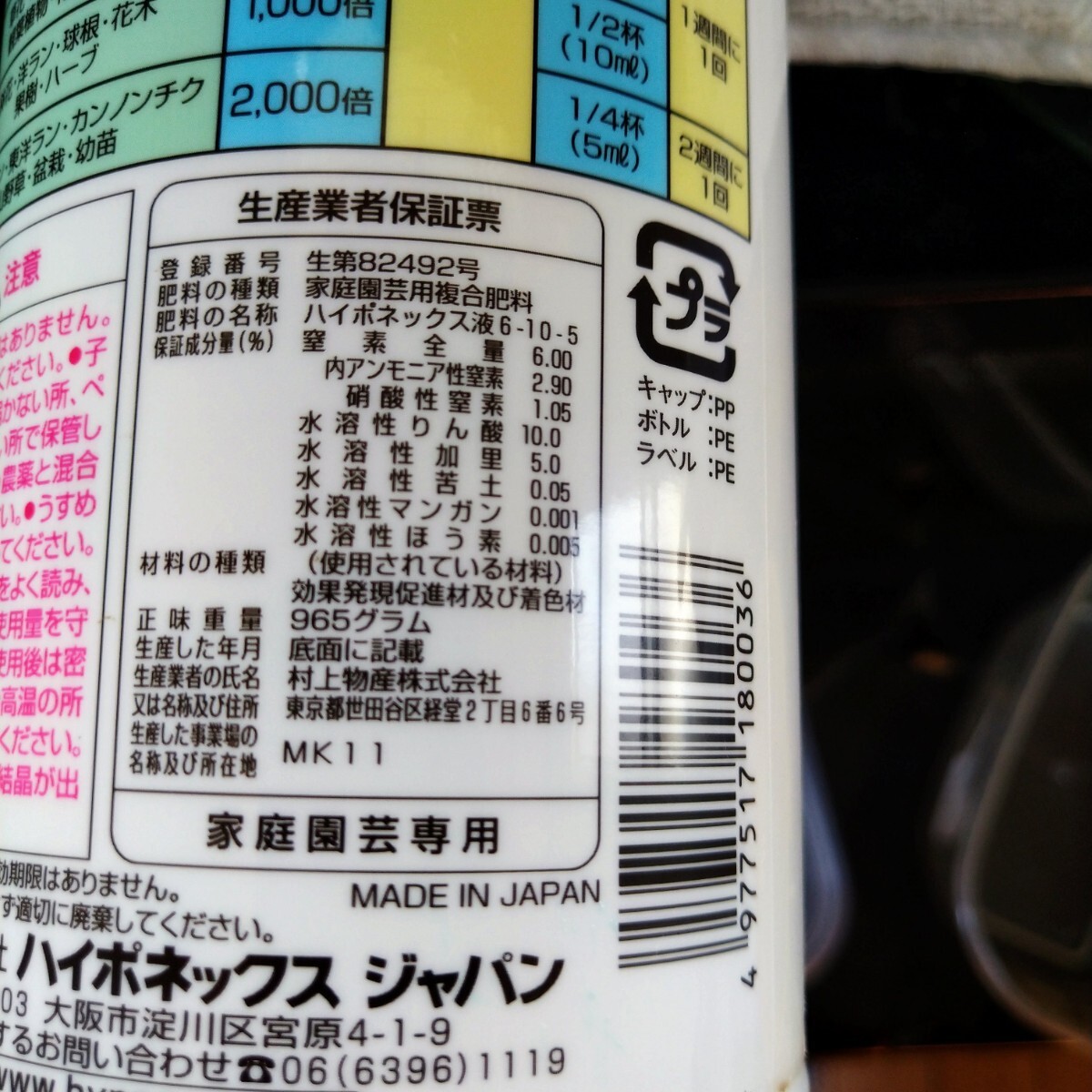 細かく分類すると天然グリーンウォーターと生クロレラ水は別物になりますが、グリーンウォーター(青水)を作るに当たって一番手っ取り早いのが生クロレラですが、生クロレラは多少高額で名前の通り“生”なので冷蔵庫保管で、更に1ヶ月間ぐらいしか長持ちしません。しかしハイポネックスは使用後キャップを閉め、直射日光や高温となる場所を避ければ15年以上も成分変化が起きず使用可能とされています。