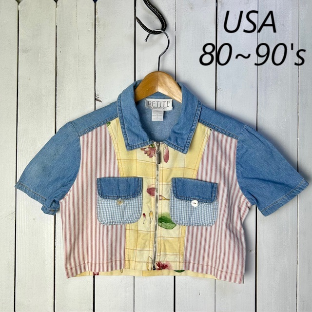 sh●972 USA古着 80s~ USA製 ベリーショート丈 デニム切替えジップシャツジャケット 2  オールド ヴィンテージ アメリカ 半袖 春夏 短丈 薄手