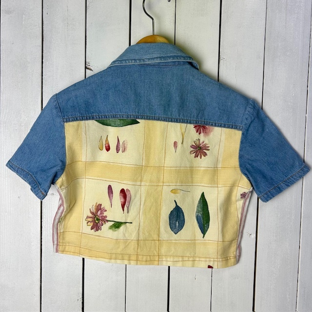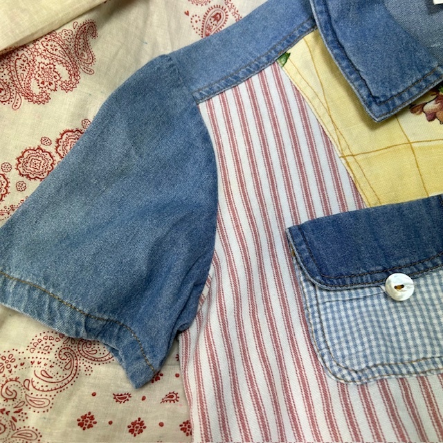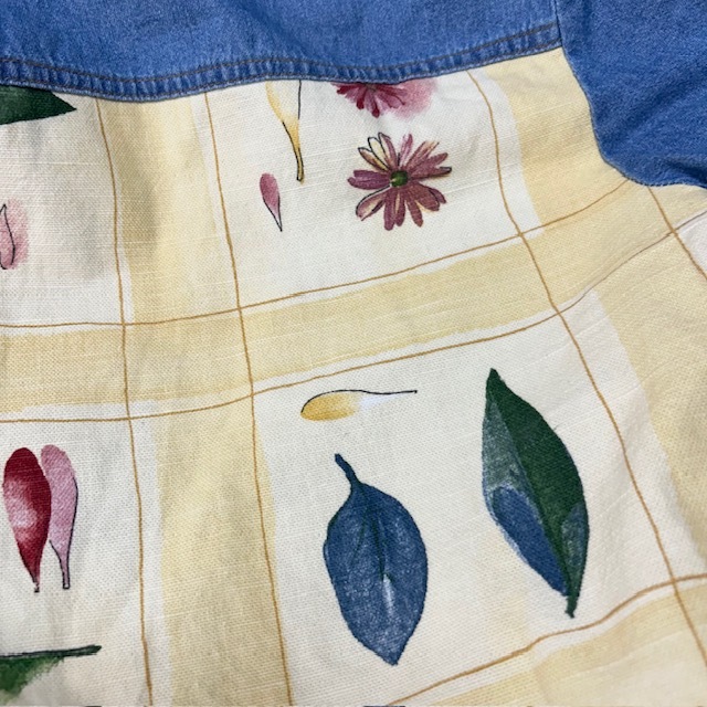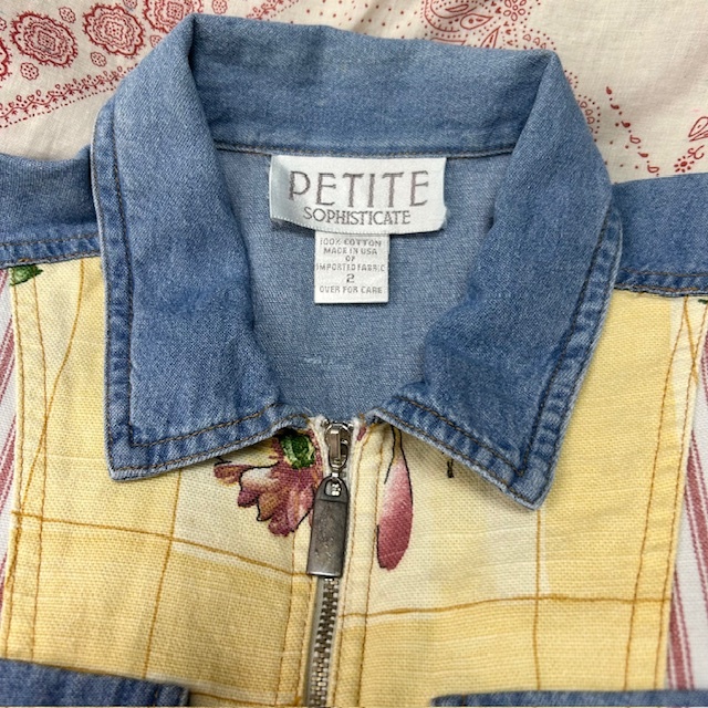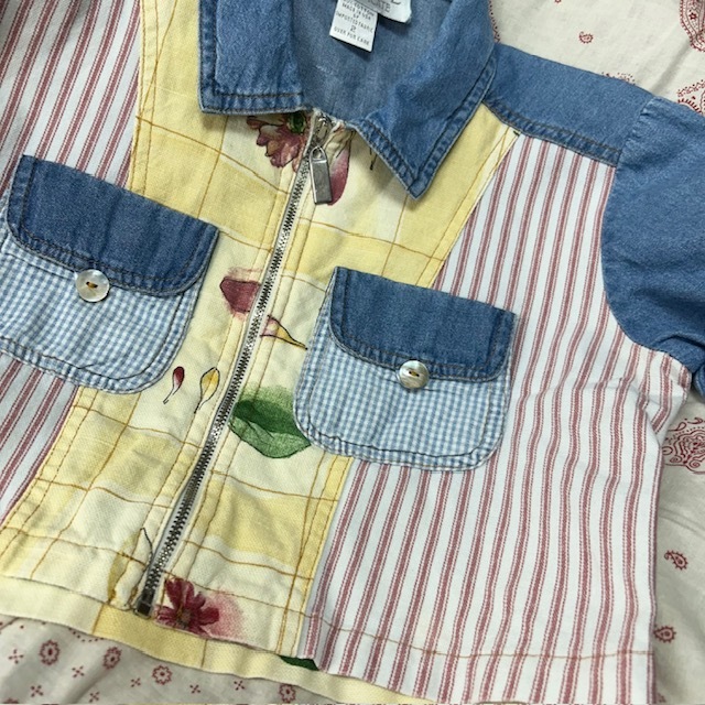 ●商品説明・・・アメリカ古着になります。80年代~90年代頃のオールド・ヴィンテージのかなりショート丈(短丈・クロップド丈)のダンガリーデニム・ストライプ・ギンガムチェック・手書きのボタニカル柄生地などの色々な生地の切り替えのジップシャツ(シャツジャケット)です。生地感的イにはデニムシャツ程度の厚さで、レイヤード使いで着ていただくような感じの一着です。made in USA (アメリカ製)で、素材はコットン100%です。USA 2表記で、S~M程度のサイズ感かと思います。