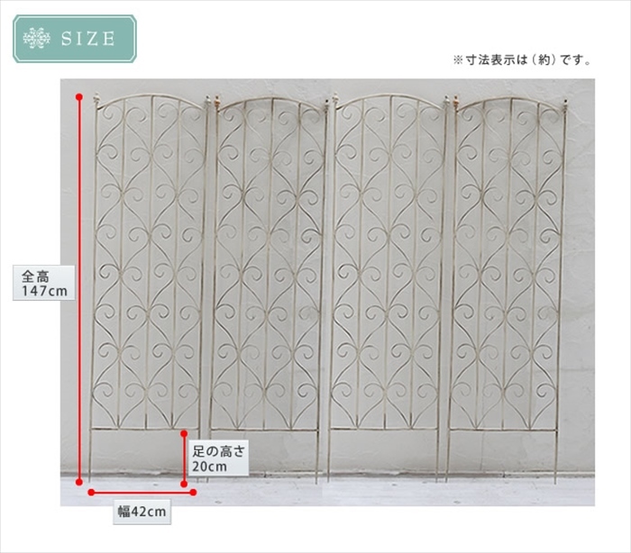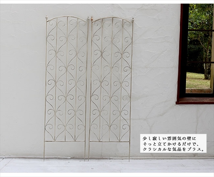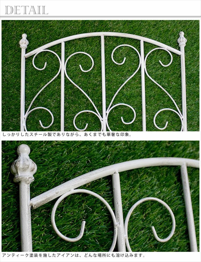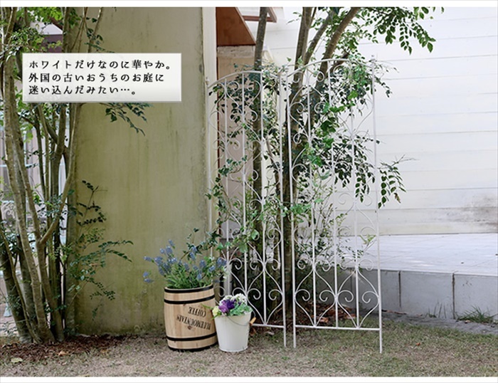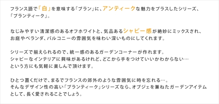 | 【ブランティーク ホワイトアイアントレリスH147 4枚組】 まるでフランスの蚤の市で買い付けたような、雰囲気のあるガーデンファニチャー・シリーズ。 あたたかな気持ちにさせてくれるフレンチ・アンティーク。 フランス語で「白」を意味する「ブラン」に、アンティークな魅力をプラスしたシリーズ、「ブランティーク」。 なじみやすい清潔感のあるオフホワイトと、気品あるシャビー感が絶妙にミックスされ、お庭やベランダ、バルコニーの雰囲気を味わい深いものにしてくれます。 シリーズで揃えられるので、統一感のあるガーデンコーナーが作れます。 シャビーなインテリアに興味があるけれど、どこから手をつけていいかわからない・・・という方にも気軽に楽しんで頂けます。 ひとつ置くだけで、まるでフランスの郊外のような雰囲気に時を忘れる・・・。 そんなデザイン性の高い「ブランティーク」シリーズなら、オブジェを兼ねたガーデンアイテムとして長く愛されることでしょう。 |
