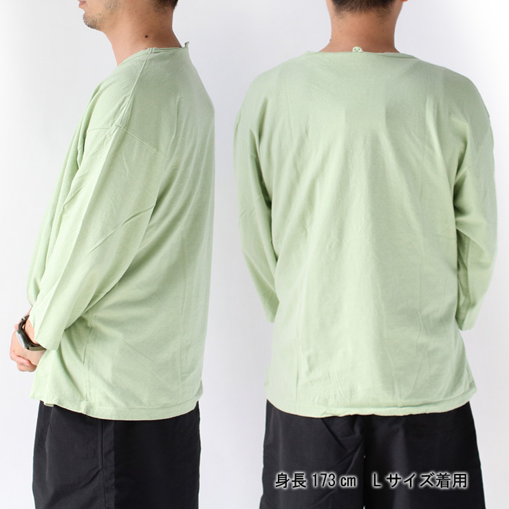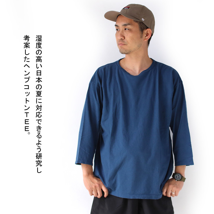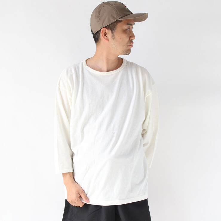 湿度の高い日本の夏を考慮し、新たに考案したヘンプコットンファブリックで作られた7分丈フットボールTee。 右撚りの糸と左撚りの糸を掛け合わせているので水を通しても斜行が起こりにくい丈夫な生地感も特徴です。 オーガニックコットン糸とヘンプコットン糸をSZ編みで1対1で仕上げました。細やかな糸を使っているので柔らかな風合いと、ヘンプコットン特有のドライで豊かな素材感も楽しめるお勧めのTEEです。