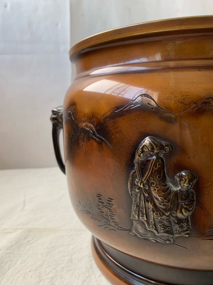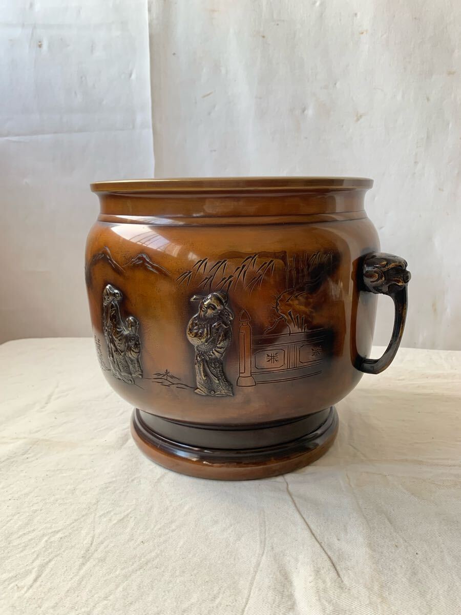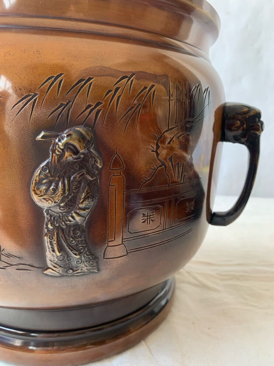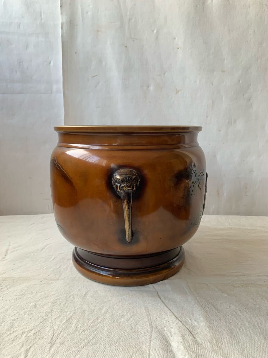 旧家蔵出し品 デザインが素敵な銅製火鉢です。サイドの持ち手も凝った作りで、火鉢としてはもちろん、鉢カバーなどとして、お部屋のインテリアやお店のディスプレイ、イベント出店時の什器などに使って頂くと素敵だと思います。