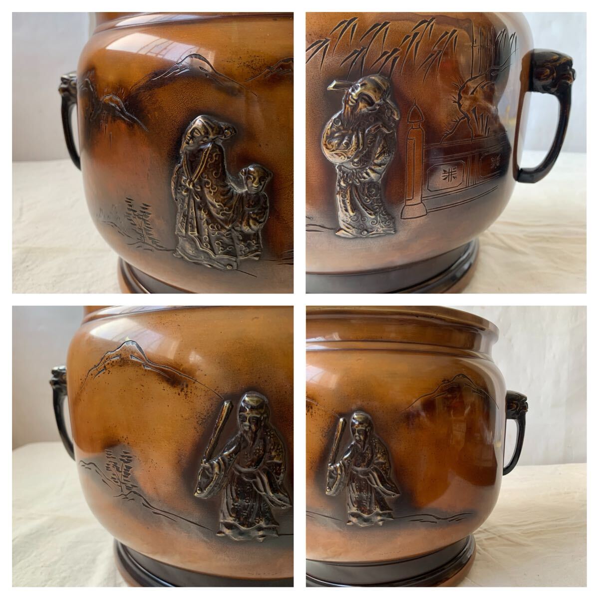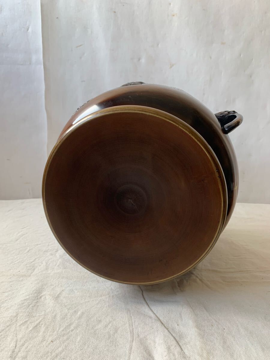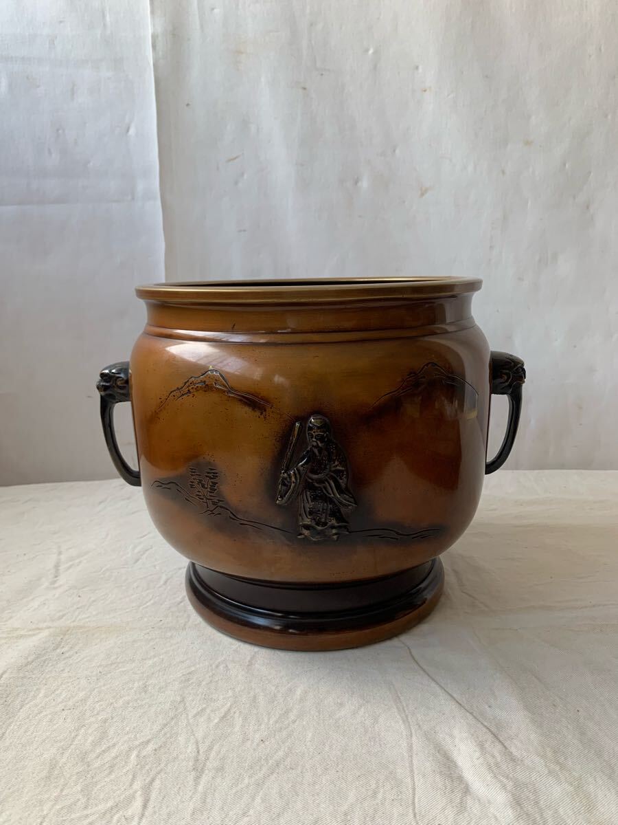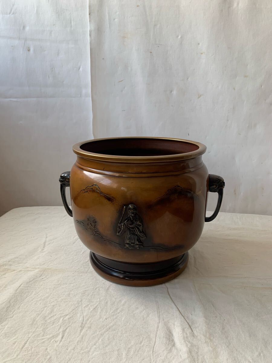 旧家蔵出し品 デザインが素敵な銅製火鉢です。サイドの持ち手も凝った作りで、火鉢としてはもちろん、鉢カバーなどとして、お部屋のインテリアやお店のディスプレイ、イベント出店時の什器などに使って頂くと素敵だと思います。