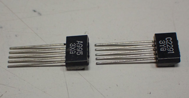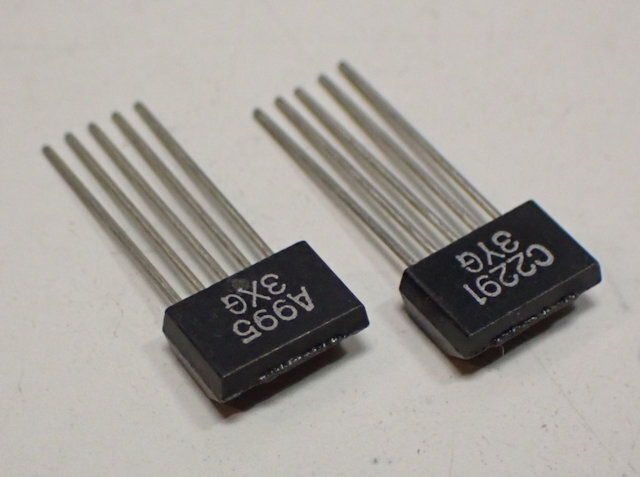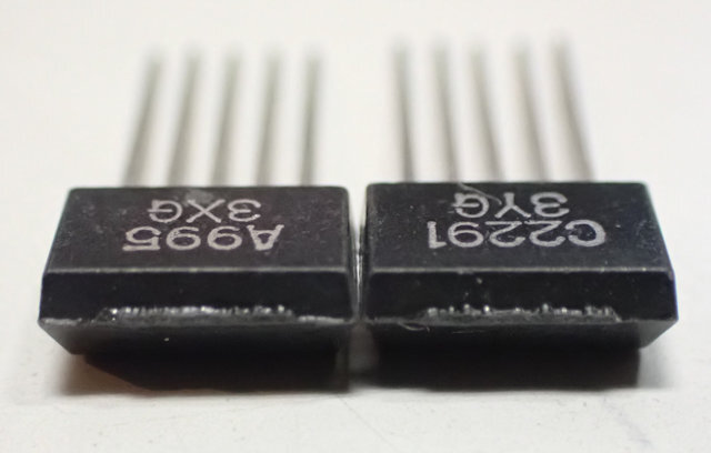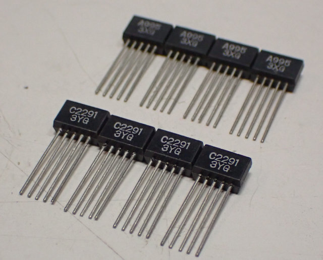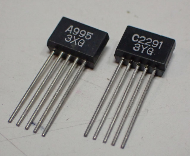 三菱が誇る2SA995/2SC2291(Gランク)のペアセットで、K式アンプやメーカ製品も含めてよく使用された名石です。オーディオ全盛時代の名石と言ってもいいでしょう。パッケージは写真の如くSIPで、ベースリード共通です。アンプ初段の定電流回路や能動回路に使われます。
