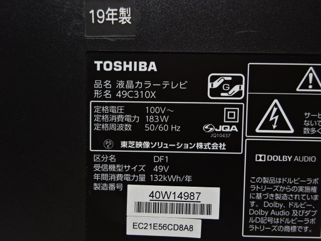 No147★東芝49型 LEDフル 4K/USB/外付けHDD/YouTube対応/テレビ/2019年製★49C310X | |