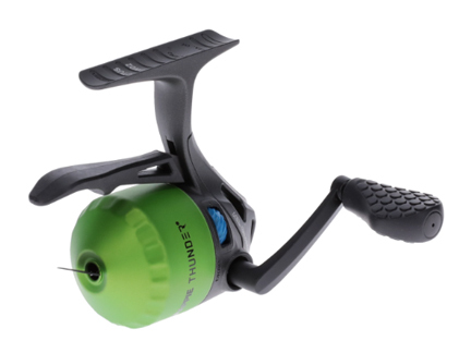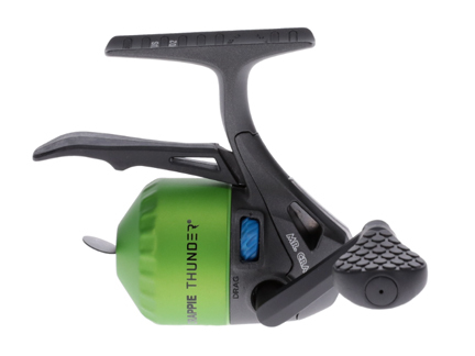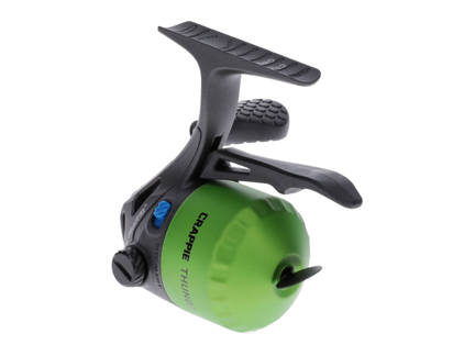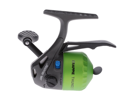 Lew's ルーズの小型アンダースピン(トリガースピン)リール、クラッピーサンダー Crappie Thunderです。型番はCTUSです。ゼブコの33マイクロのOEMモデルで、ハンドルが換装された分軽くなっていますがスペックはほぼ同じです。1ベアリングで、ラインキャパシティはUSA-4Lbs(約1.5号)が90yds(約82m)です。ギア比は4.3:1で、ハンドル1回転当たり巻上量は16インチ(約40.6cm)です。ボディ高は約91mm、ボディ長さは約72mm、重さは166g(ライン含)です。セラミック製デュアルピックアップピン、ラインアウトアラーム(バイトアラート)を採用しています。ハンドルは左右共用です。USA4Lbsのナイロンラインが巻いてあります。並行輸入品ですので国内保証書は付きません。包装はブリスターパックになります。