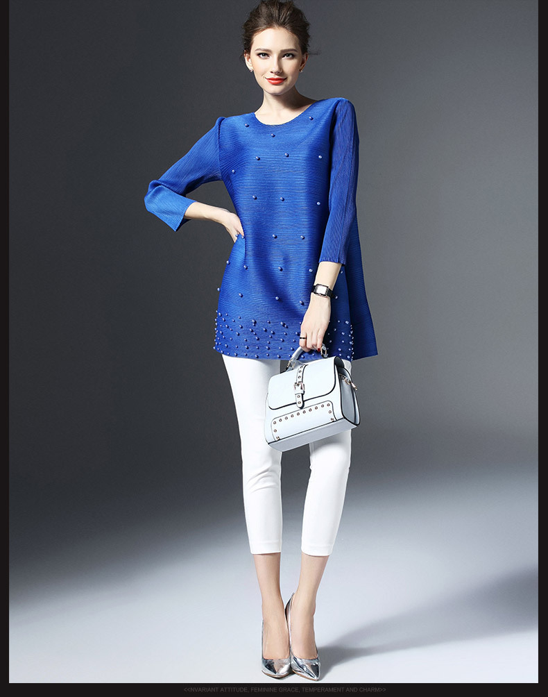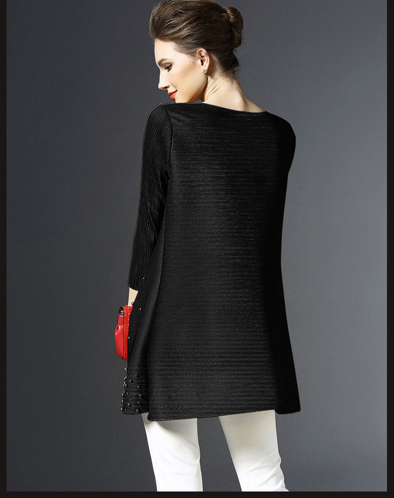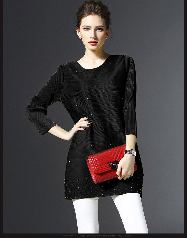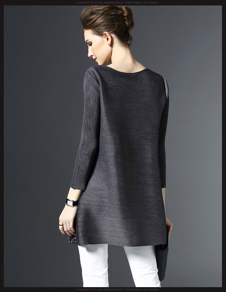 「同梱1万円送料無料」レディーストップスプリーツpleats 長袖シャツブラウス上着肌触り弾力ドレープ性 がいいビーズ飾り黑