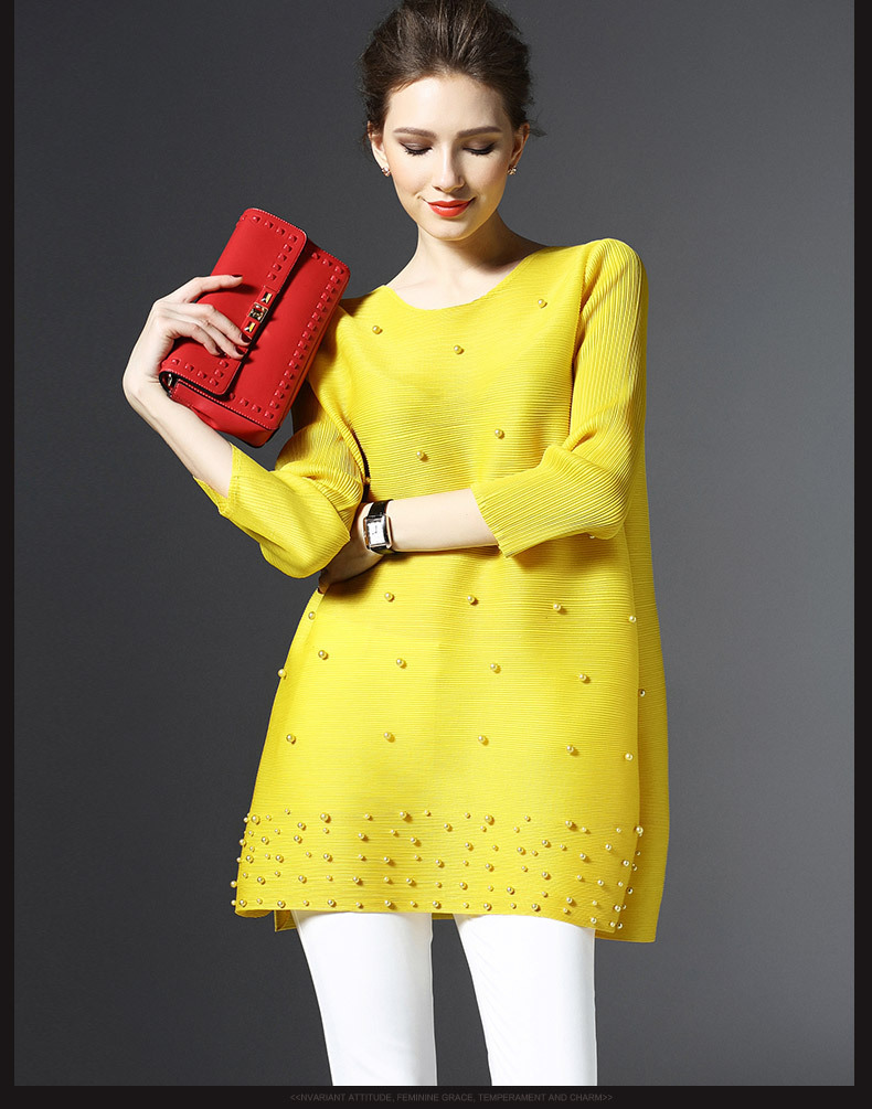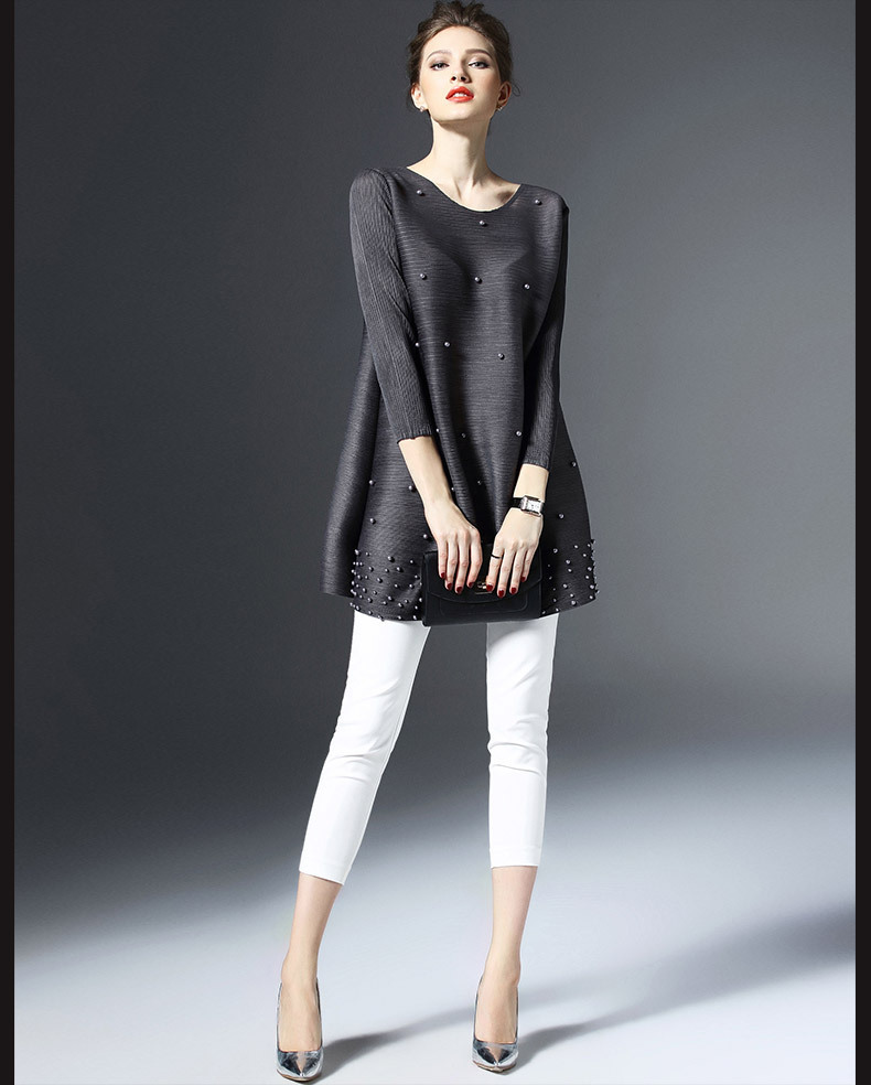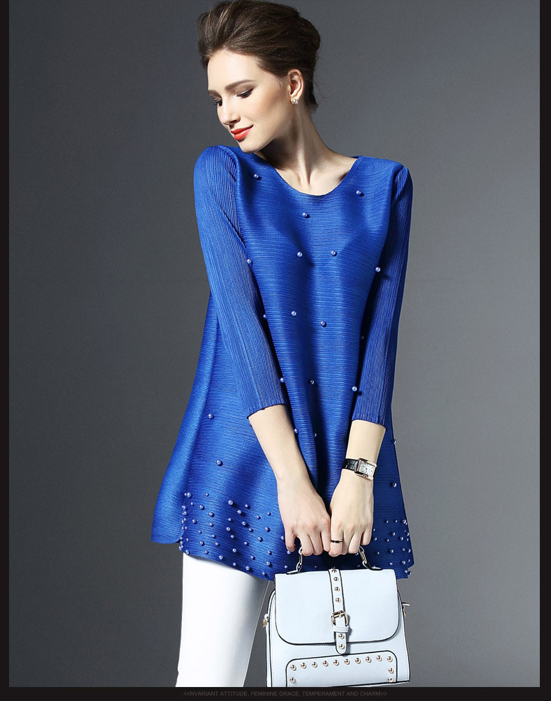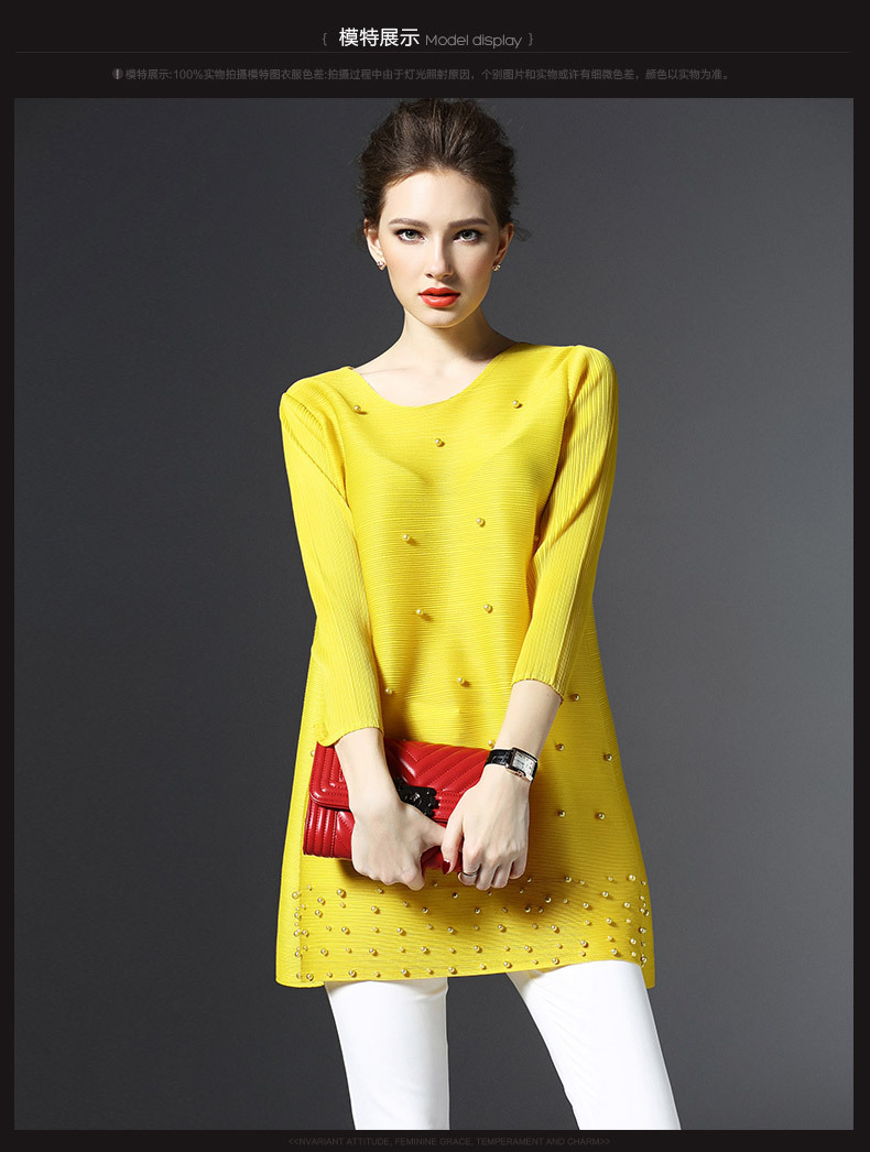 「同梱1万円送料無料」レディーストップスプリーツpleats 長袖シャツブラウス上着肌触り弾力ドレープ性 がいいビーズ飾り黑
