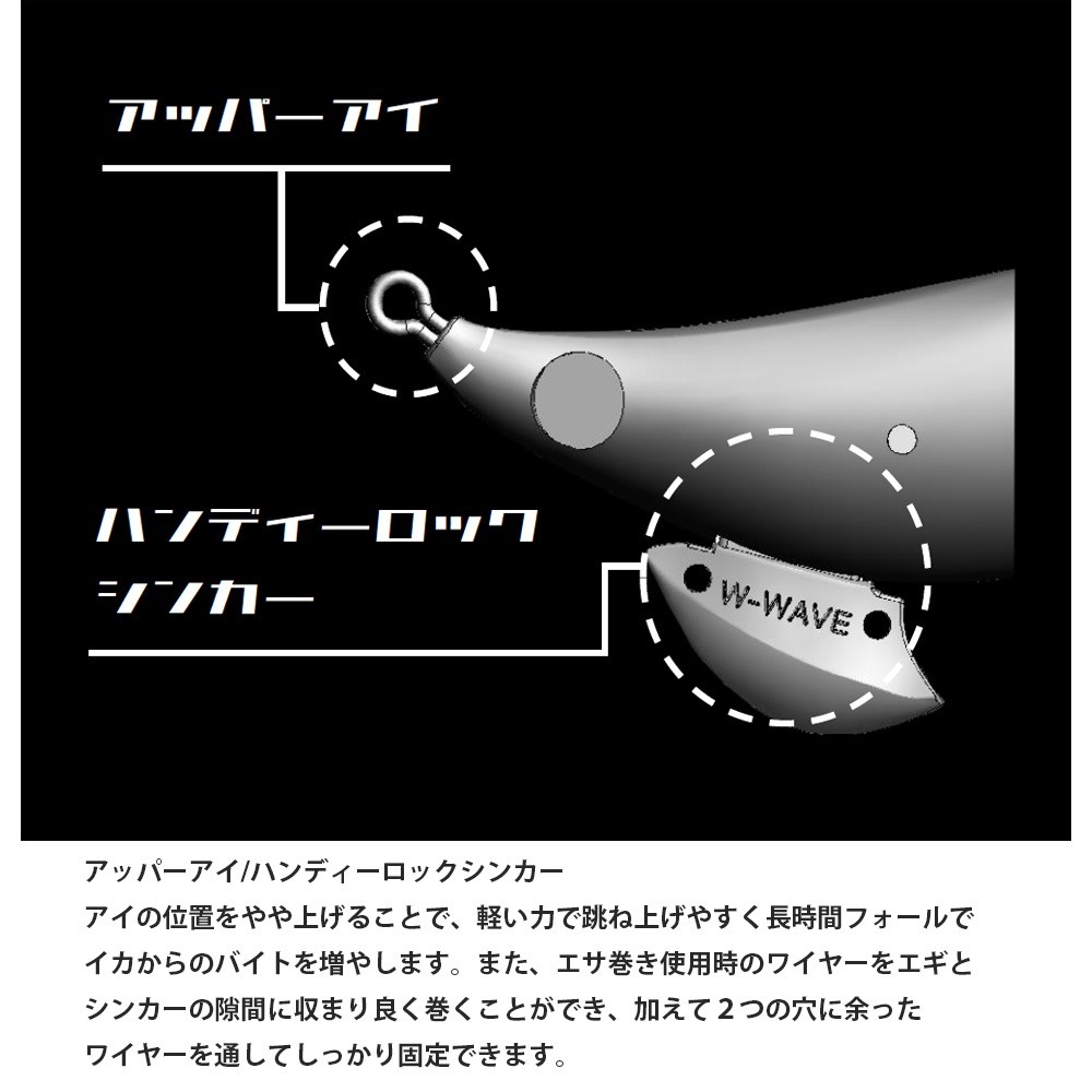 また、付属のエサ巻きワイヤーを使用しエサを乗せれば、エサ巻きエギとしてヤリイカ・スルメイカ等の釣りにもベストマッチ。