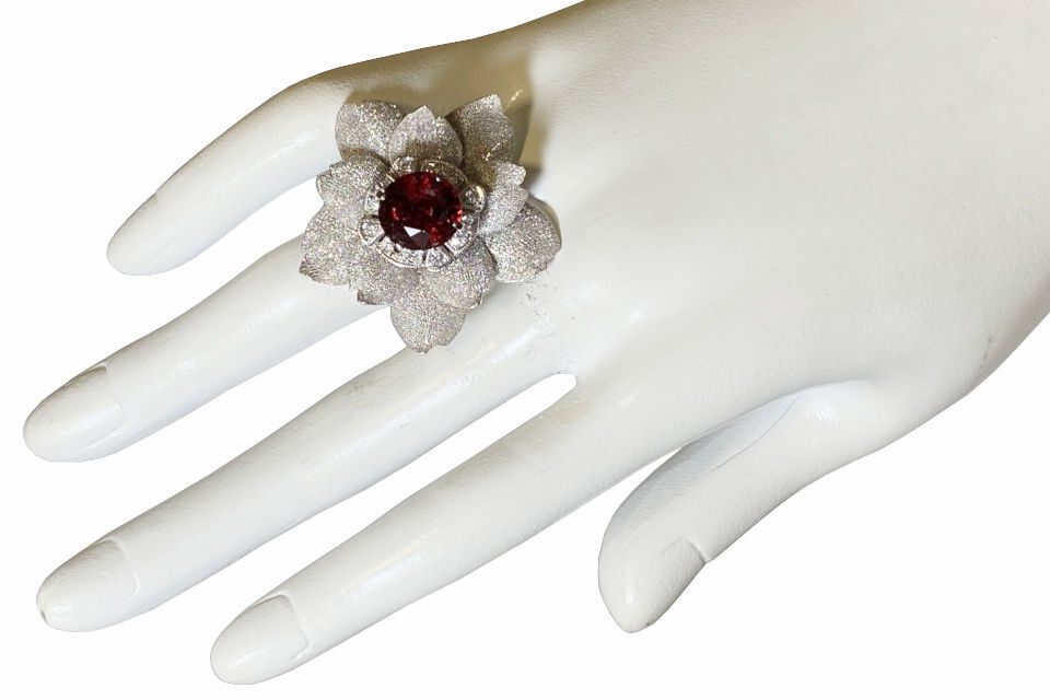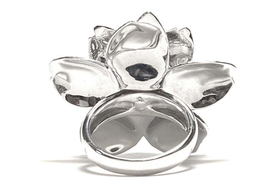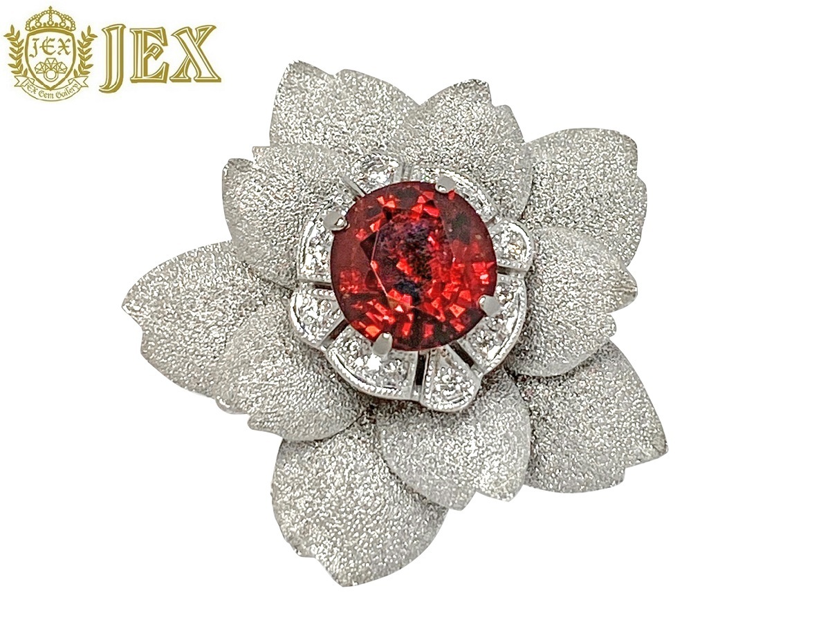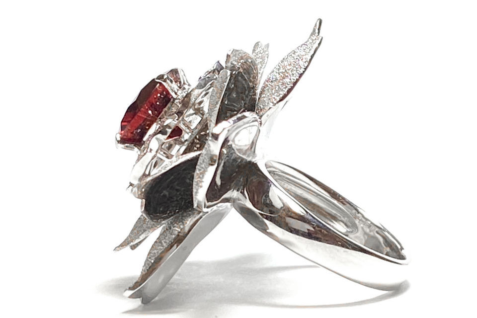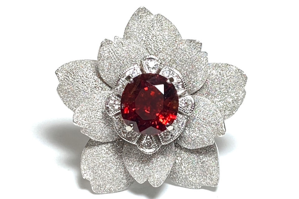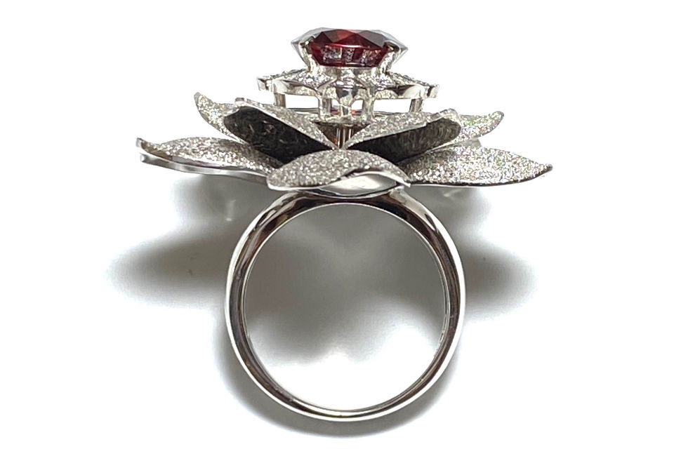 解説 | 銀砂を思わせる抑えた光沢との対比で、強い輝きを放つ深紅が、溜息が出るほどドラマチックに。花びらの先の造作には、繊細さが宿るよう。大粒スピネルの情熱たぎる煌めきが、忘れ得ぬ淑女(レディー)へと演出してくれるでしょう。 |