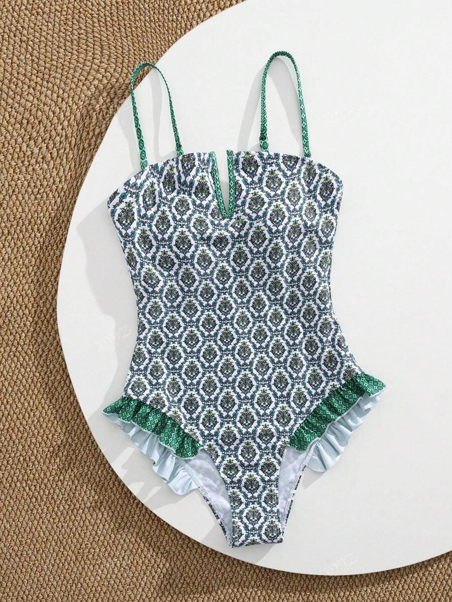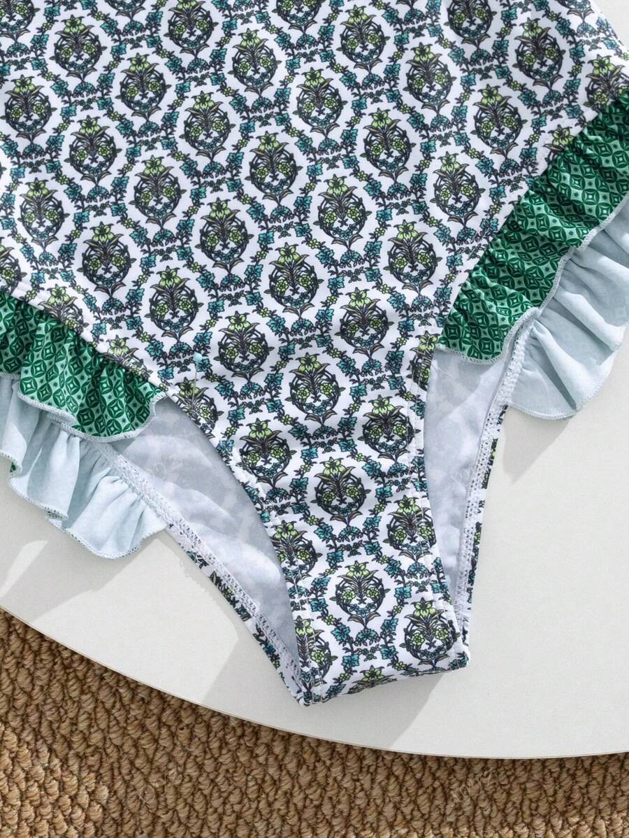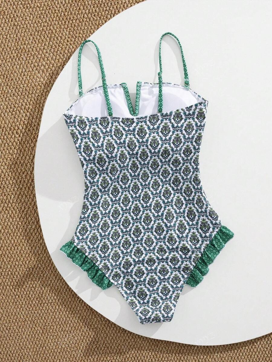 レディース 水着 ワンピース 2025年新作 ココナッツの木連続柄 カラーブロック フリル トリム ファッショナブル ワンピース式