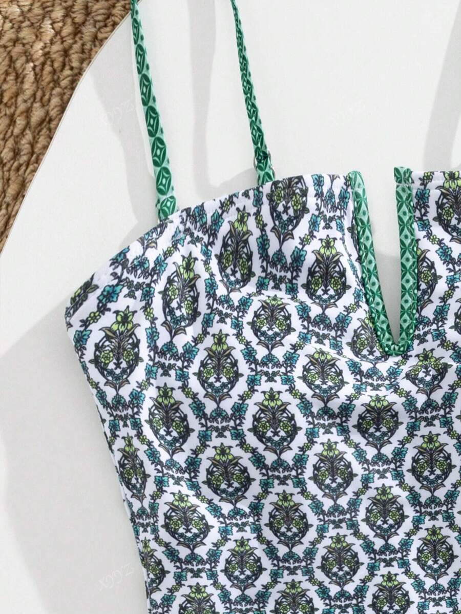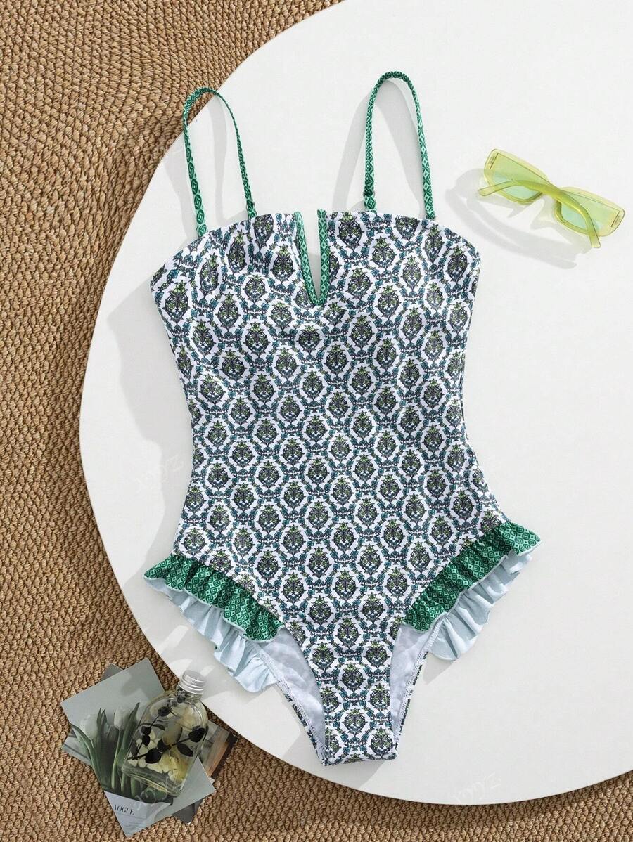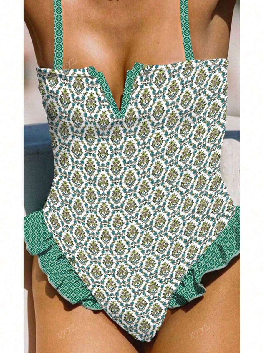 レディース 水着 ワンピース 2025年新作 ココナッツの木連続柄 カラーブロック フリル トリム ファッショナブル ワンピース式
