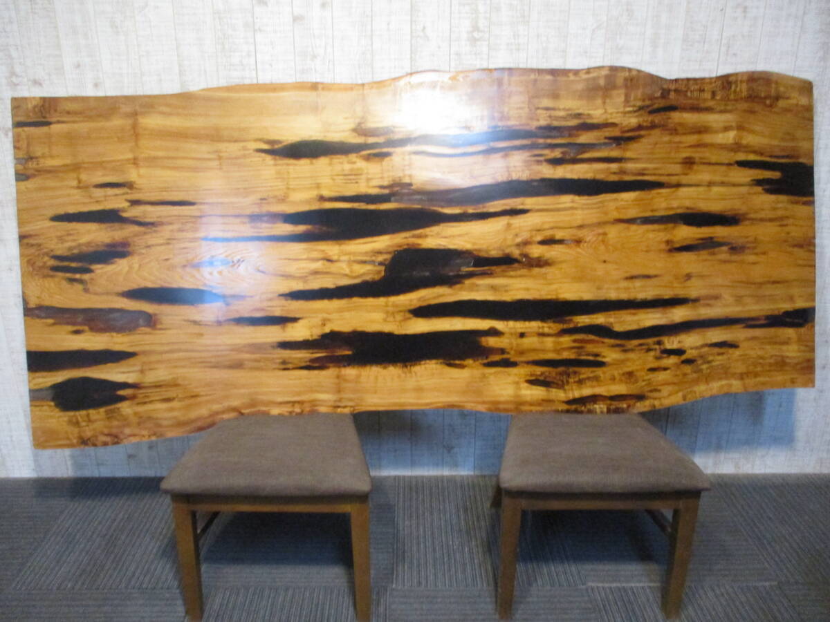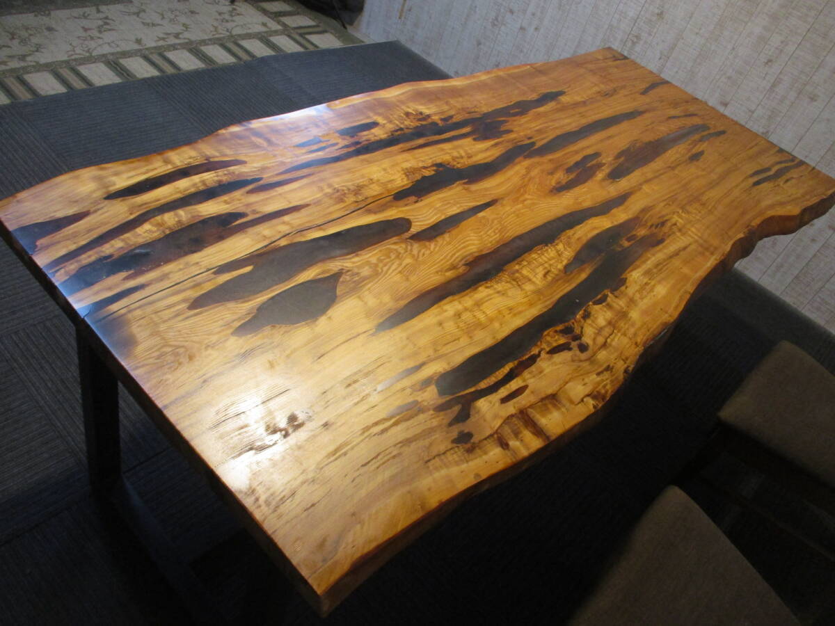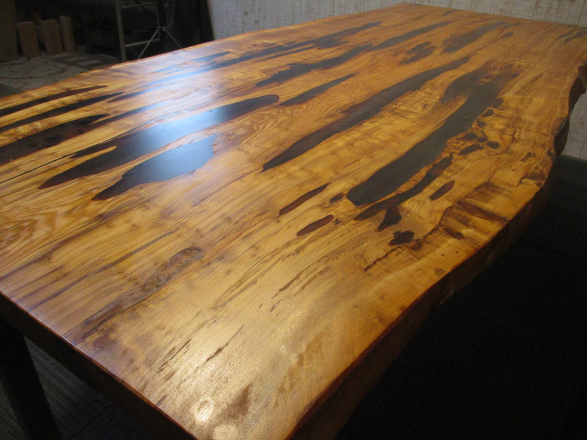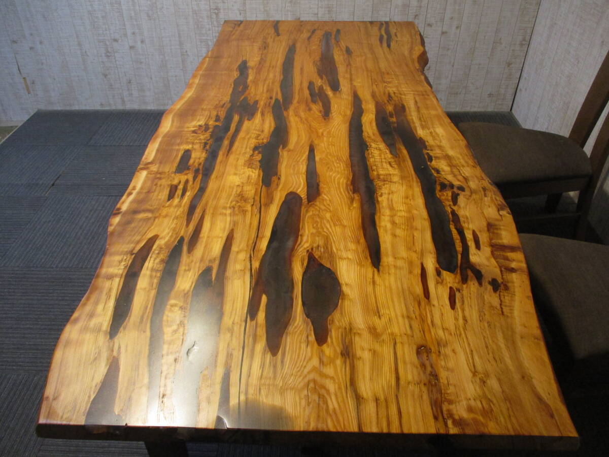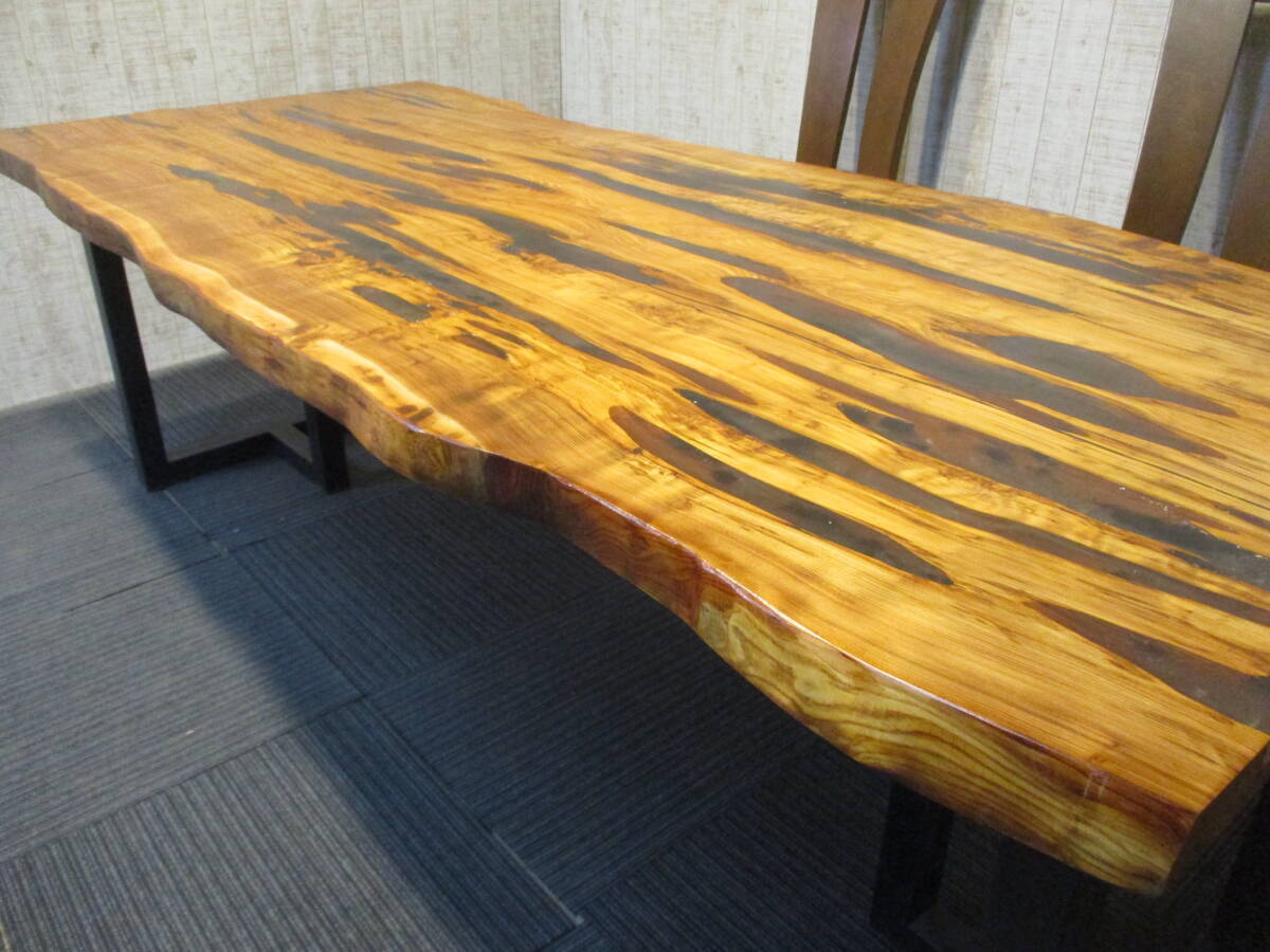 屋久杉の一枚板無垢のテーブルです。屋久杉の表面を焼きだしにして、その焼き跡にレジンを流し込み磨き上げたものです。立派なテーブルの完成です。奥行きも厚みもあります。両面きれいに仕上げてお送りします。