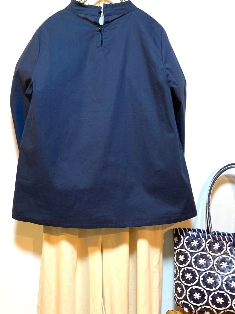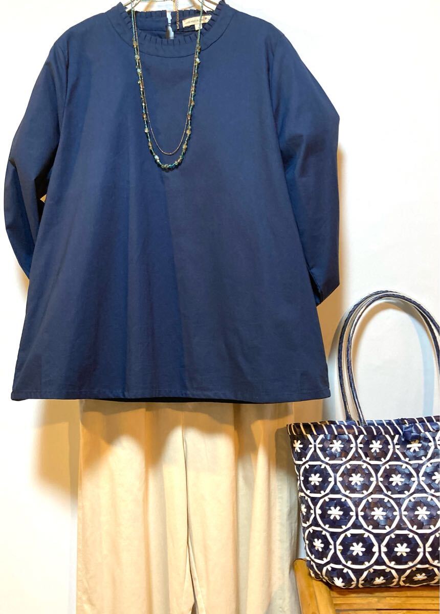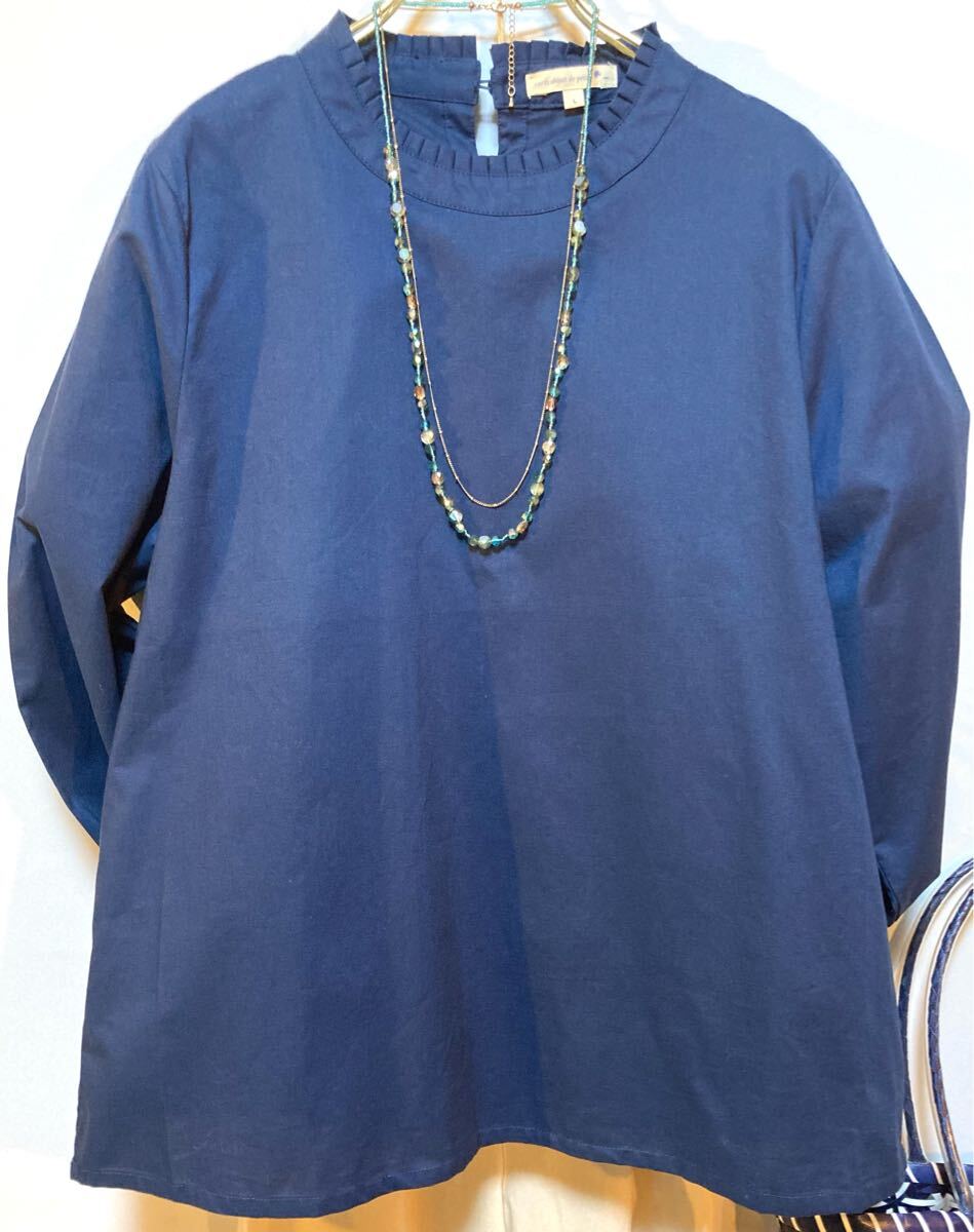 送料無料♪新品タグ付!  C100%   *ネイビー無地 ミニフリルブラウス 長袖* Lサイズ    ユトリコ  CHA-CA.