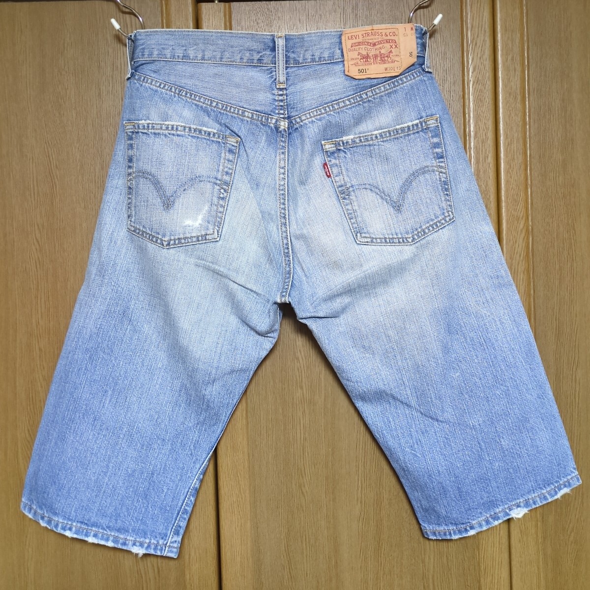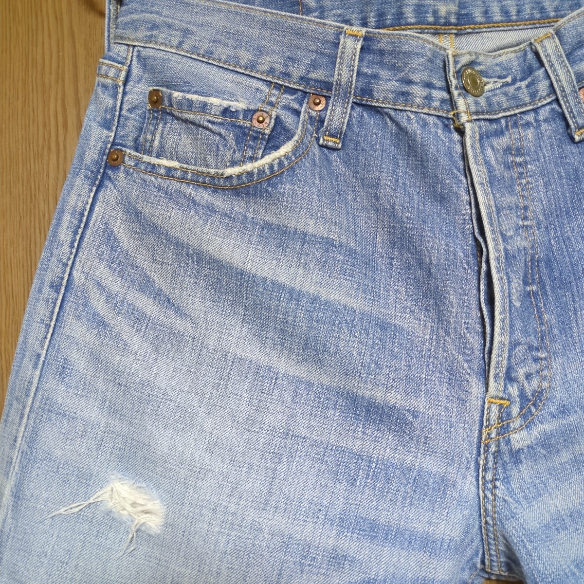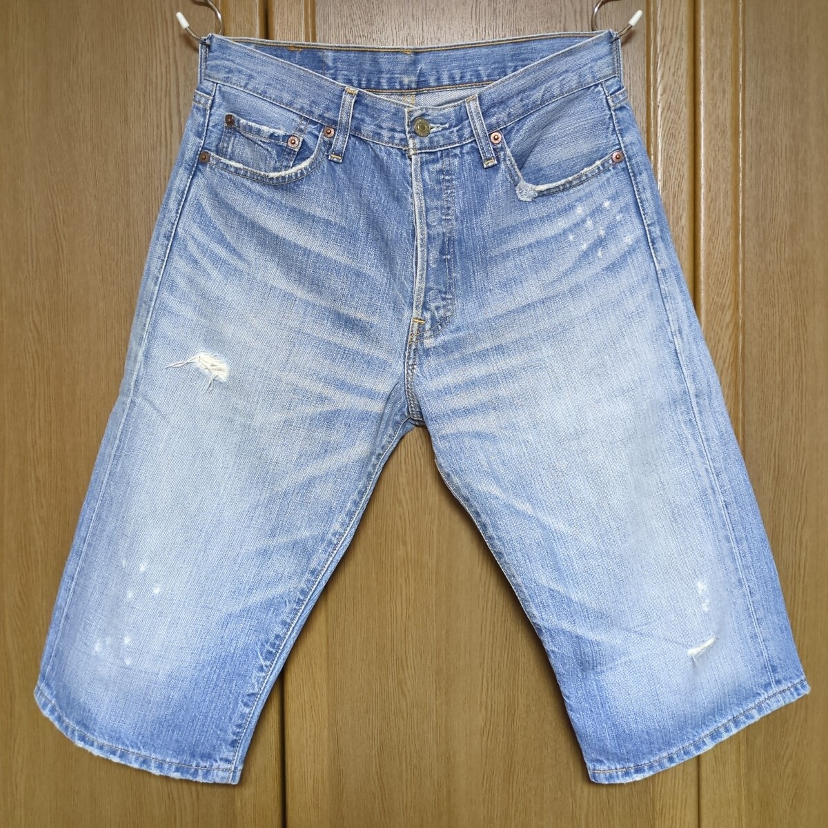 リーバイス501のデニムのショートパンツです。USED加工、クラッシュ加工でいい味出ております。ボタンフライです。若干の使用感ございますが、特に大きなダメージも無く(元からのUSED加工はございます)、まだまだ着用して頂けるかと思います。あくまでもUSED品になりますので、神経質な方、古着、USED加工物のご理解のない方、入札お断りです。サイズは、メーカー表記W30L15で、平置き採寸で、ウエスト40センチ、前股上28、5センチ、股下38センチ、太ももあたり27センチ、裾幅23センチ、総丈63,5センチ(サイドで計測)です。素人採寸ですので多少の誤差はお許しください。