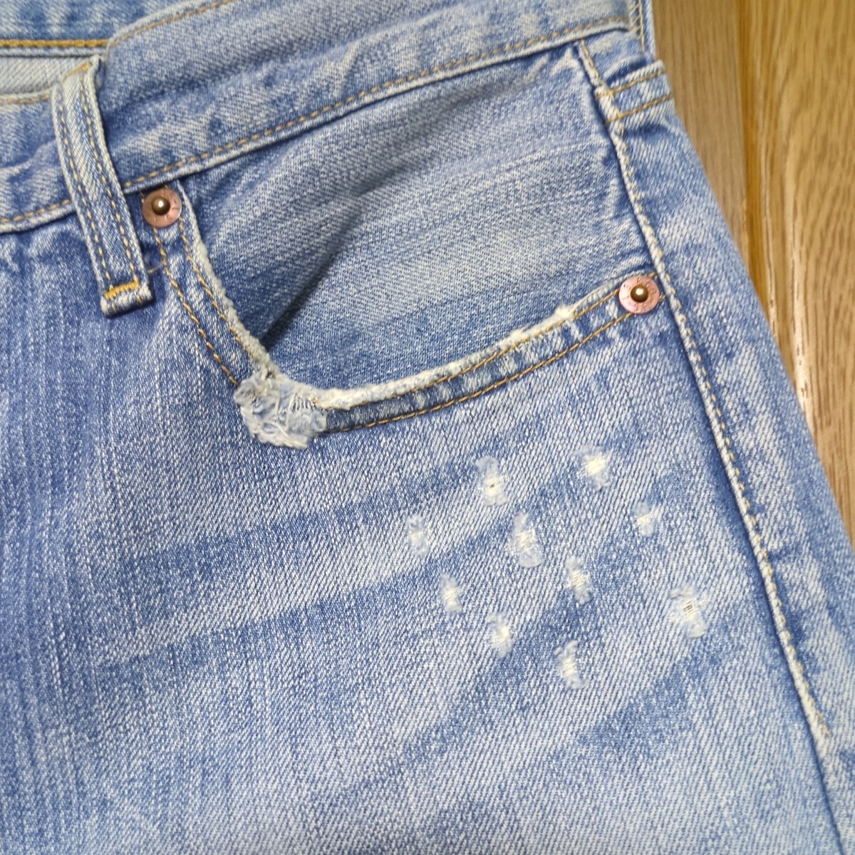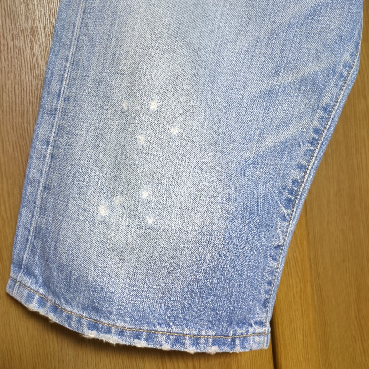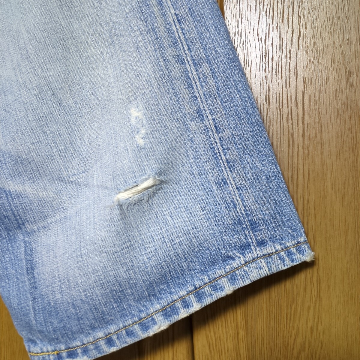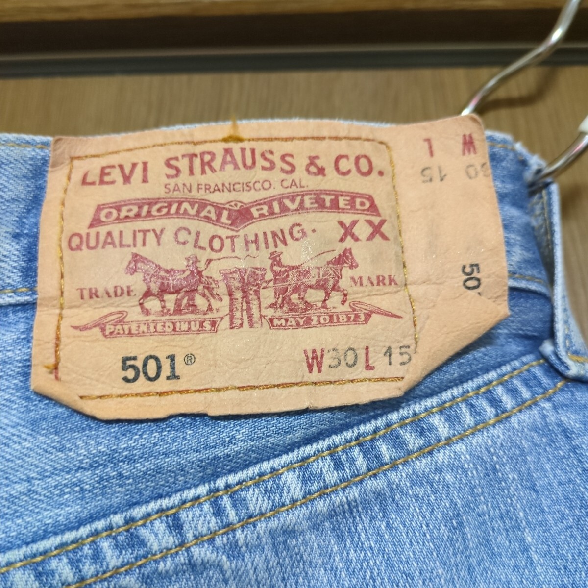 リーバイス501のデニムのショートパンツです。USED加工、クラッシュ加工でいい味出ております。ボタンフライです。若干の使用感ございますが、特に大きなダメージも無く(元からのUSED加工はございます)、まだまだ着用して頂けるかと思います。あくまでもUSED品になりますので、神経質な方、古着、USED加工物のご理解のない方、入札お断りです。サイズは、メーカー表記W30L15で、平置き採寸で、ウエスト40センチ、前股上28、5センチ、股下38センチ、太ももあたり27センチ、裾幅23センチ、総丈63,5センチ(サイドで計測)です。素人採寸ですので多少の誤差はお許しください。