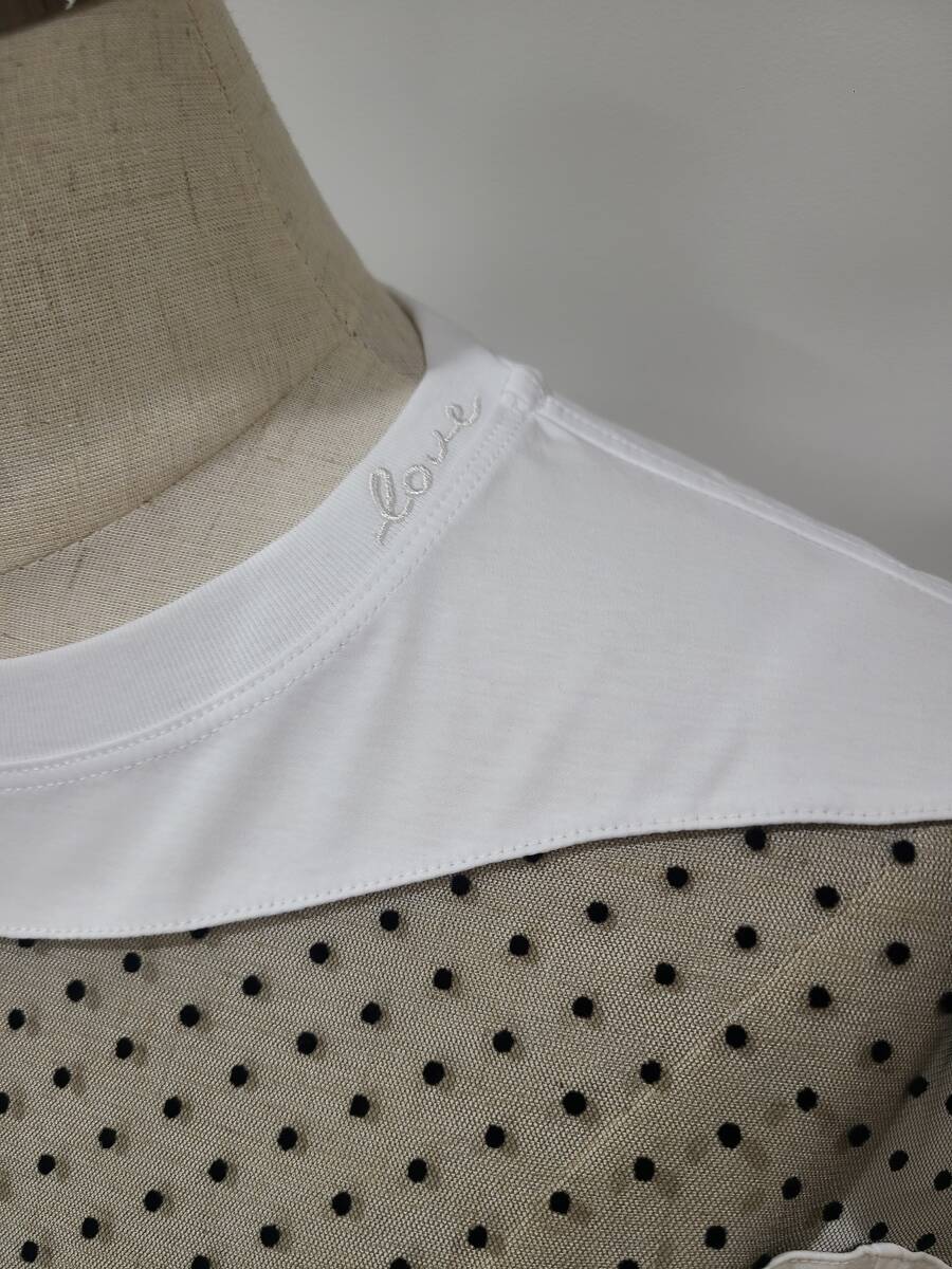 左恵理部分に「LOVE]の刺繍がありかわいいTシャツになります。 ※右肩上に小さな薄い茶色色素がついていますがその他は新品未使用になります。