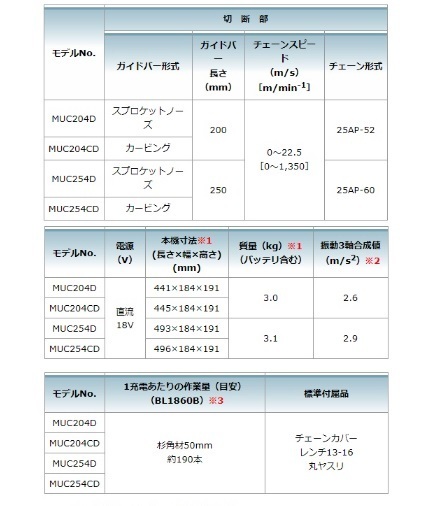 ・1充電あたりの作業量(目安)(BL1860B) : 杉角材50mm 約190本