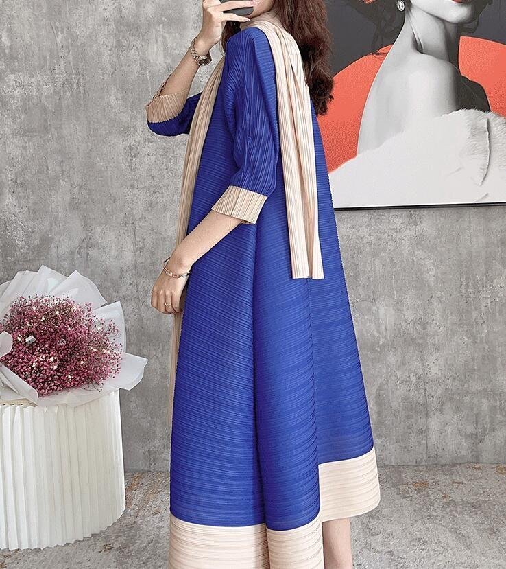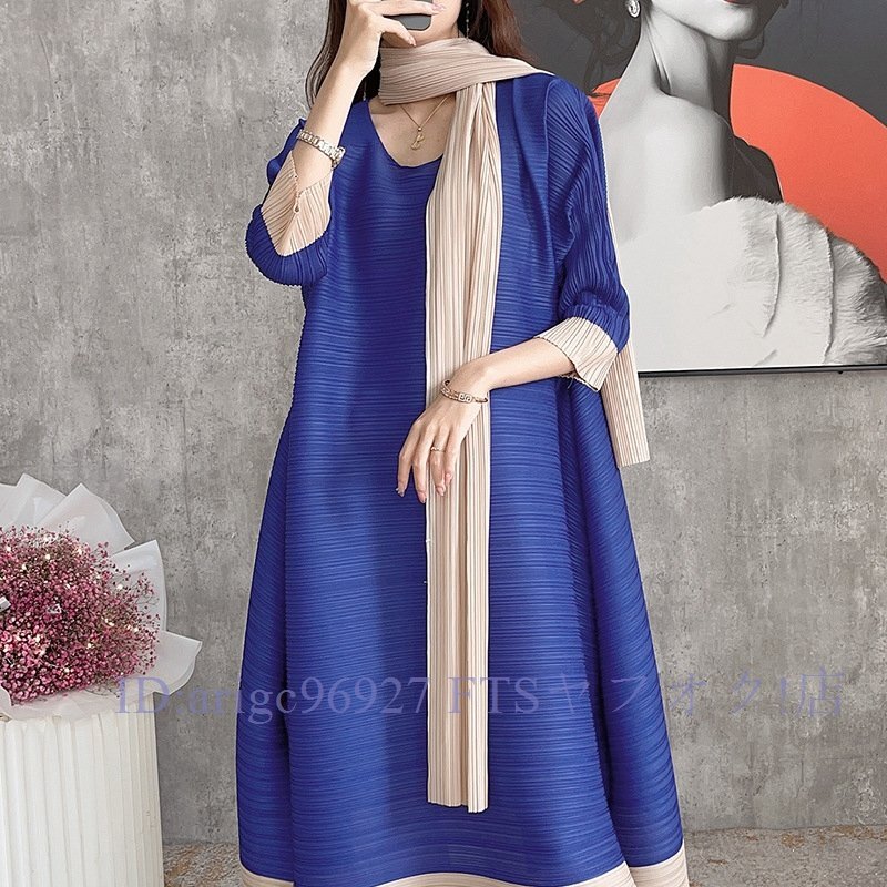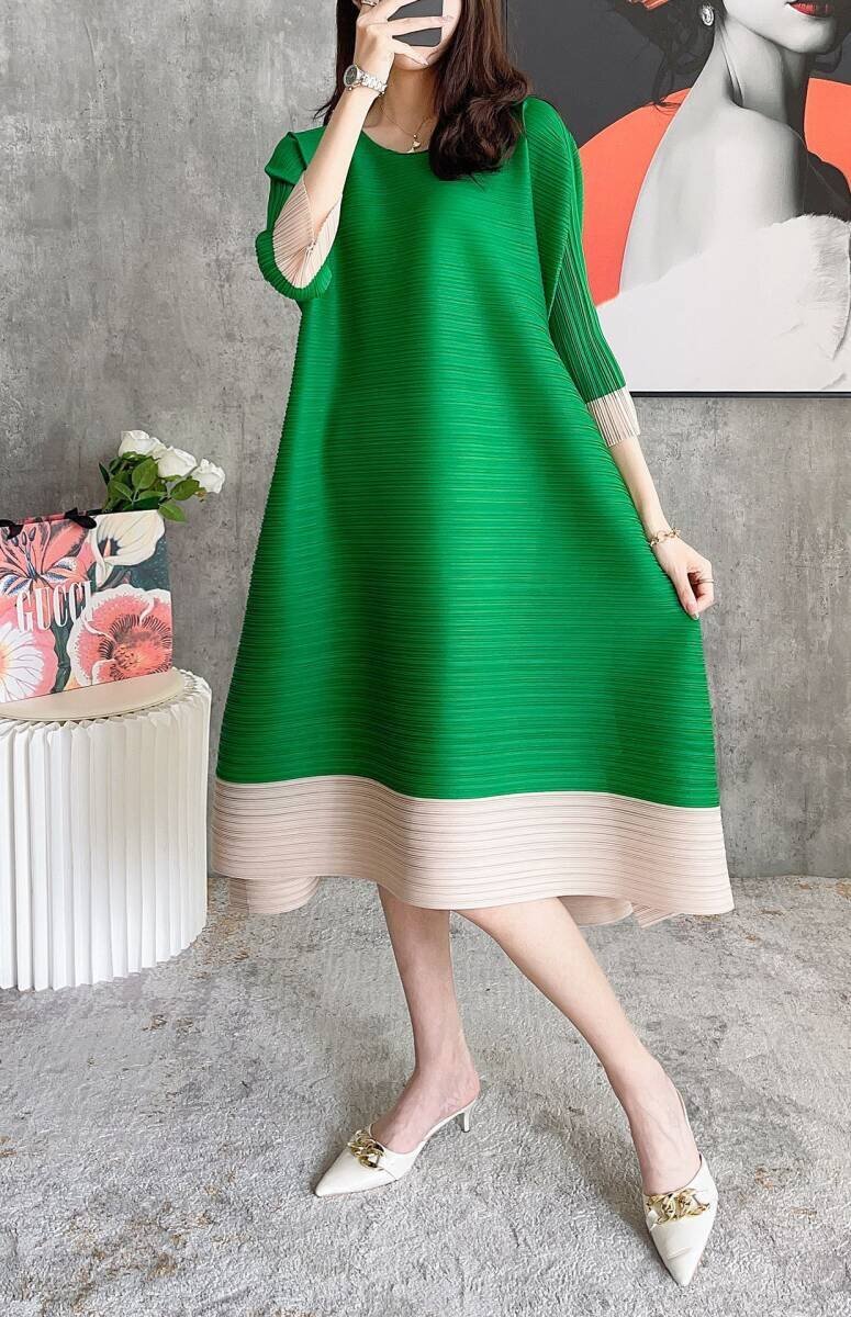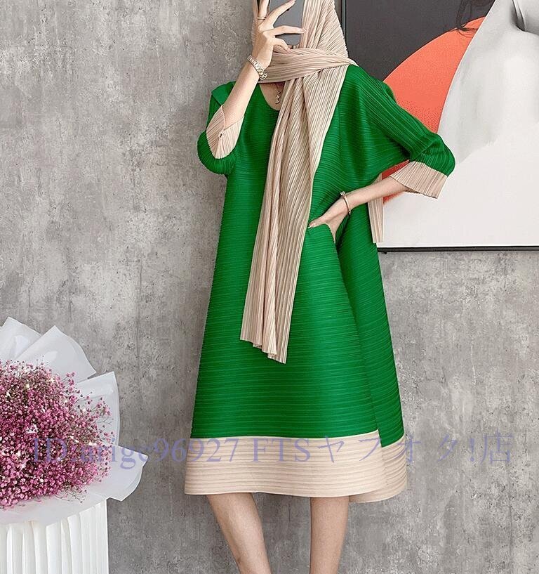 B0529☆新品レディーストップス プリーツワンピース チュニック 弾力がありドレープ性いい スカーフ付き緑色