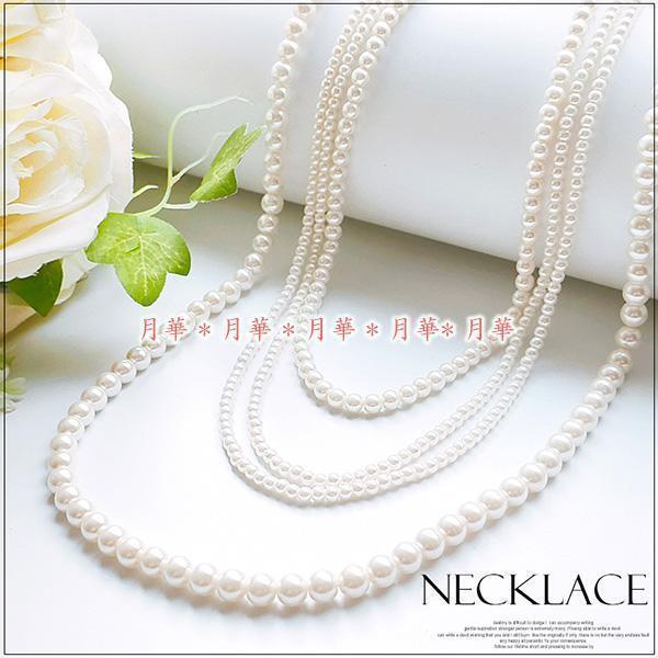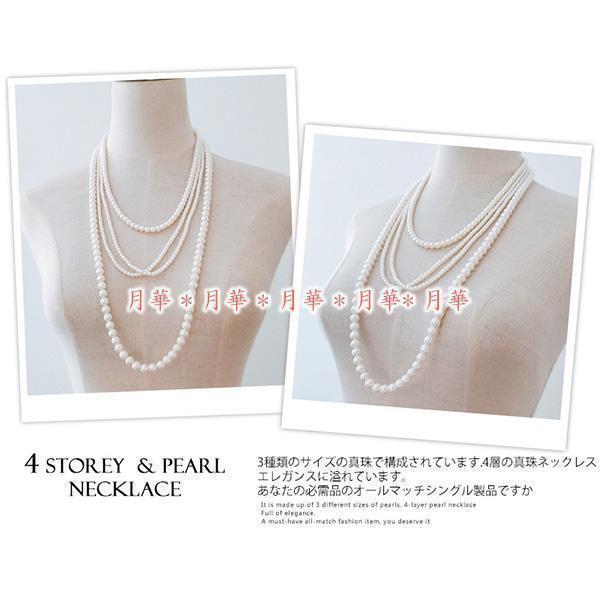 異なるサイズの3つのパールが重なり合う4連のネックレス。