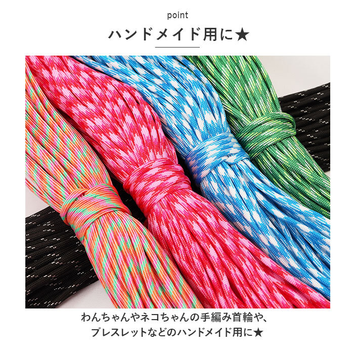 | 商品説明 | ・・ハンドクラフトに最適!柔らかく編みやすいパラコード31m! ・【ハンドメイド用に★】 ・わんちゃんやネコちゃんの手編み首輪や、ブレスレットなどのハンドメイド用に★ ・【ワンカラーで編んでもバイカラーで編んでも】 ・柔らかいので複雑な編み方もラクラク♪鮮やかなネオンカラーから落ち着いたダークカラーまで揃っているから、ワンカラーで編んでもバイカラーで編んでも◎ ・【素敵なハンドメイドライフを】 ・プチプラなので、色んなカラーを揃えて素敵なハンドメイドライフを楽しんで♪ ・※こちらはハンドメイド用の商品となります。キャンプや登山など、アウトドアでのご利用はお控え下さい。 |