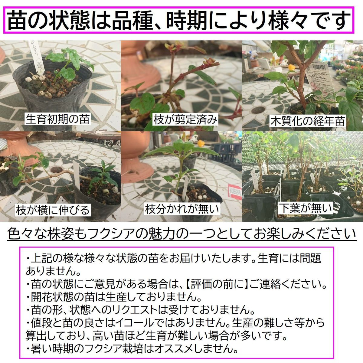 ・苗の状態維持の為の枝葉の剪定を随時行っております。剪定状態での苗をお届けする場合がありますが、生育には問題ありませんのでご了承くださいませ。