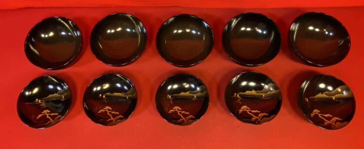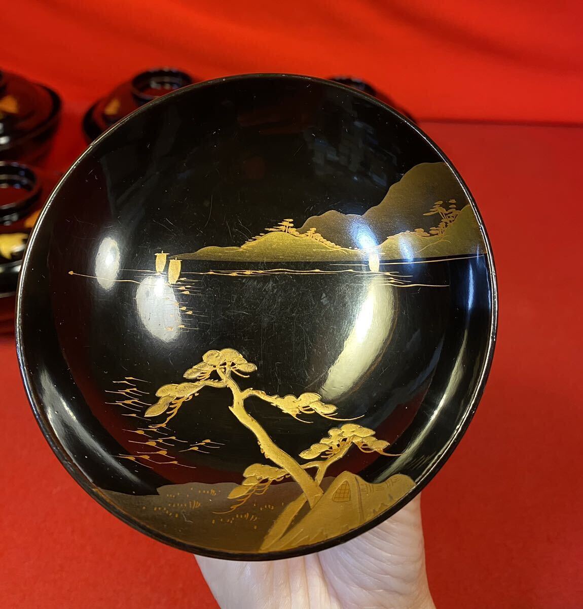 蓋表に3羽の千鳥蒔絵、蓋の内側に松の高蒔絵と山河に帆船の蒔絵が施されております。